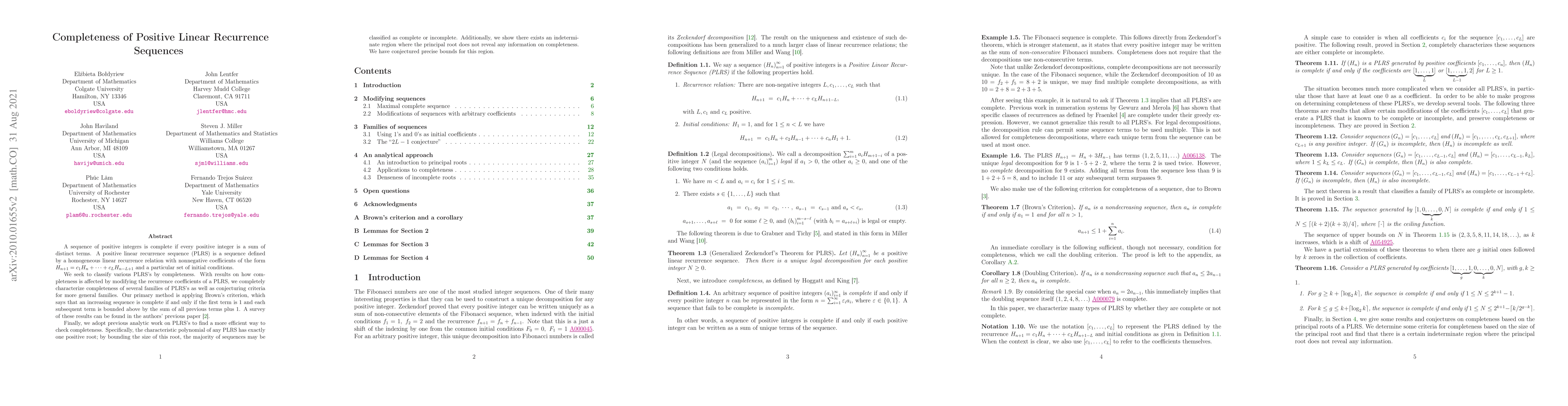 This paper investigates the completeness of positive linear recurrence sequences (PLRS), defining completeness as the property where every positive integer can be expressed as a sum of distinct terms from the sequence. It classifies various PLRS families by completeness, using Brown's criterion and characteristic polynomial analysis to determine conditions for completeness and identifies an indeterminate region where the principal root offers no completeness information, with proposed bounds for this region.