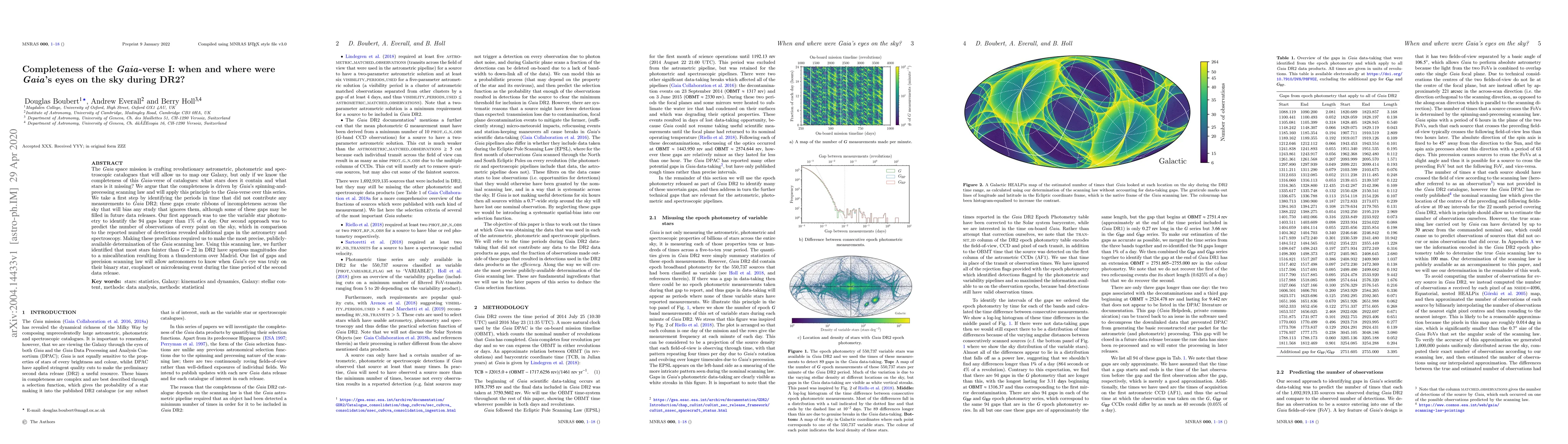The Gaia space mission is crafting revolutionary astrometric, photometric and spectroscopic catalogues that will allow us to map our Galaxy, but only if we know the completeness of this Gaia-verse of catalogues: what stars does it contain and what stars is it missing? We argue that the completeness is driven by Gaia's spinning-and-precessing scanning law and will apply this principle to the Gaia-verse over this series. We take a first step by identifying the periods in time that did not contribute any measurements to Gaia DR2; these gaps create ribbons of incompleteness across the sky that will bias any study that ignores them, although some of these gaps may be filled in future data releases. Our first approach was to use the variable star photometry to identify the 94 gaps longer than 1% of a day. Our second approach was to predict the number of observations of every point on the sky, which in comparison to the reported number of detections revealed additional gaps in the astrometry and spectroscopy. Making these predictions required us to make the most precise, publicly-available determination of the Gaia scanning law. Using this scanning law, we further identified that most stars fainter than $G=22$ in DR2 have spurious magnitudes due to a miscalibration resulting from a thunderstorm over Madrid. Our list of gaps and precision scanning law will allow astronomers to know when Gaia's eye was truly on their binary star, exoplanet or microlensing event during the time period of the second data release.