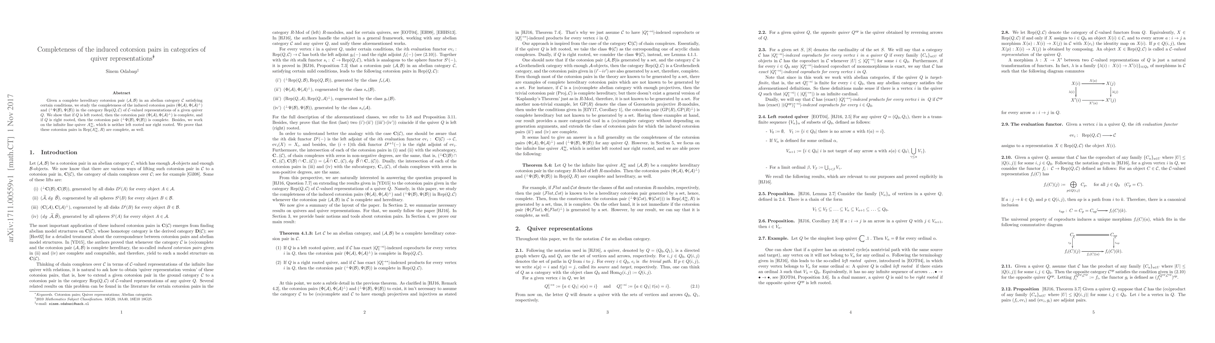 Given a complete hereditary cotorsion pair $(\mathcal{A}, \mathcal{B})$ in an abelian category $\mathcal{C}$ satisfying certain conditions, we study the completeness of the induced cotorsion pairs $(\Phi(\mathcal{A}), \Phi(\mathcal{A})^{\perp})$ and $(^{\perp}\Psi(\mathcal{B}), \Psi(\mathcal{B}) )$ in the category $\mbox{Rep}(Q, \mathcal{C})$ of $\mathcal{C}$-valued representations of a given quiver $Q$. We show that if $Q$ is left rooted, then the cotorsion pair $(\Phi(\mathcal{A}), \Phi(\mathcal{A})^{\perp})$ is complete, and if $Q$ is right rooted, then the cotorsion pair $(^{\perp}\Psi(\mathcal{B}), \Psi(\mathcal{B}) )$ is complete. Besides, we work on the infinite line quiver $A_{\infty}^{\infty}$, which is neither left rooted nor right rooted. We prove that these cotorsion pairs in $\mbox{Rep}(A_{\infty}^{\infty}, R)$ are complete, as well.