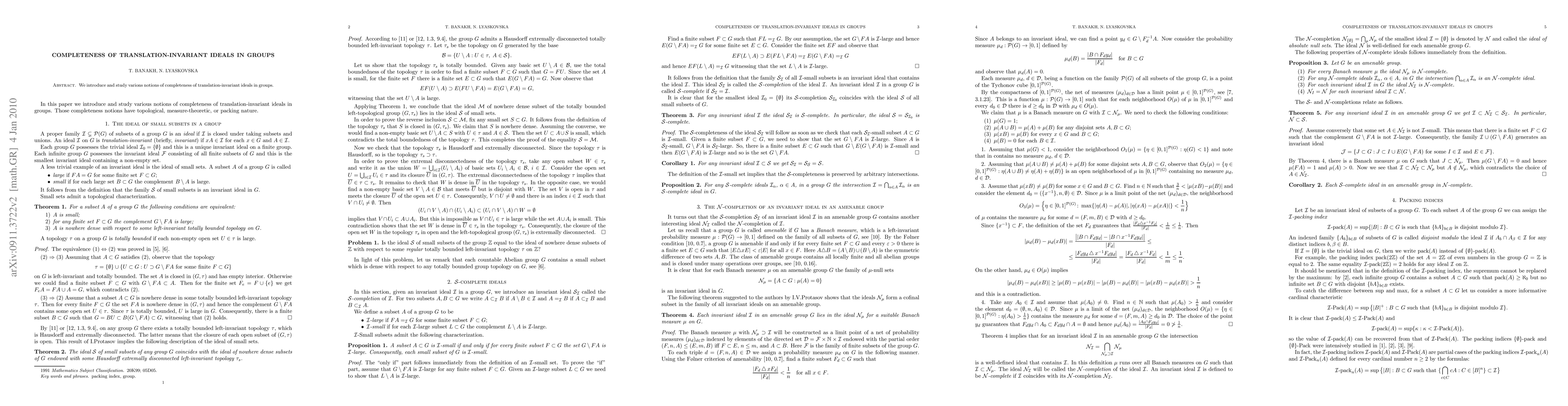 Two-line summary: This paper explores different notions of completeness for translation-invariant ideals in groups, aiming to understand their structural properties and implications within the algebraic framework of group theory. The study contributes to the broader understanding of the interplay between group theory and ideal theory.