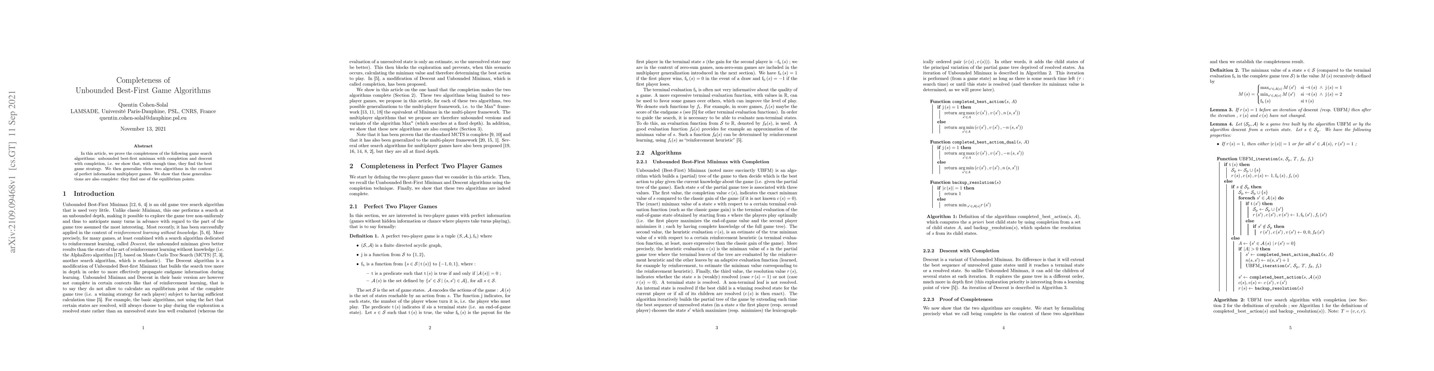 In this article, we prove the completeness of the following game search algorithms: unbounded best-first minimax with completion and descent with completion, i.e. we show that, with enough time, they find the best game strategy. We then generalize these two algorithms in the context of perfect information multiplayer games. We show that these generalizations are also complete: they find one of the equilibrium points.