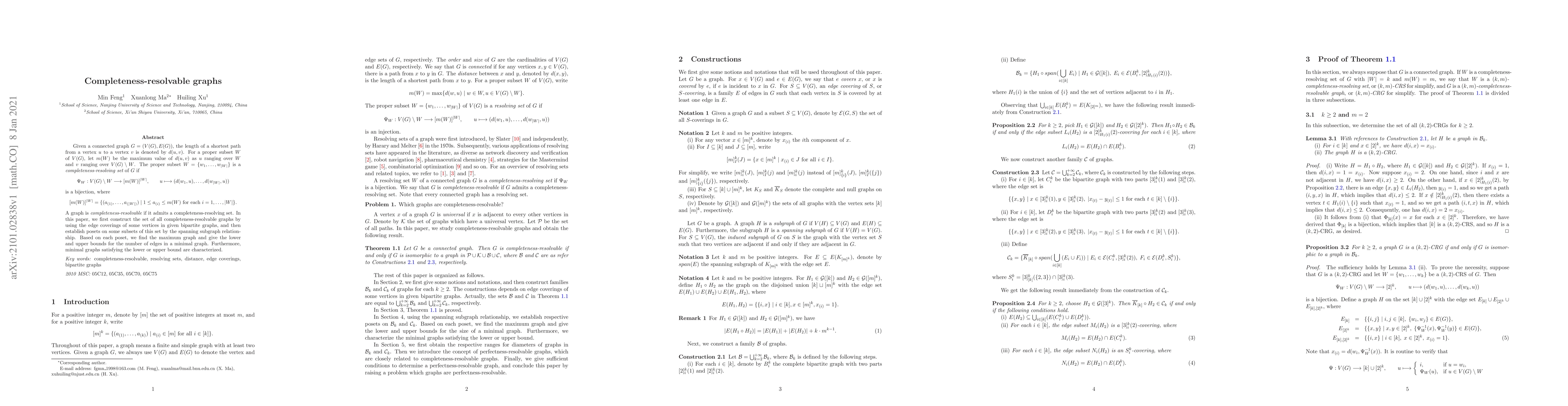 Given a connected graph $G=(V(G), E(G))$, the length of a shortest path from a vertex $u$ to a vertex $v$ is denoted by $d(u,v)$. For a proper subset $W$ of $V(G)$, let $m(W)$ be the maximum value of $d(u,v)$ as $u$ ranging over $W$ and $v$ ranging over $V(G)\setminus W$. The proper subset $W=\{w_1,\ldots,w_{|W|}\}$ is a {\em completeness-resolving set} of $G$ if $$ \Psi_W: V(G)\setminus W \longrightarrow [m(W)]^{|W|},\qquad u\longmapsto (d(w_1,u),\ldots,d(w_{|W|},u)) $$ is a bijection, where $$ [m(W)]^{|W|}=\{(a_{(1)},\ldots,a_{(|W|)})\mid 1\leq a_{(i)}\leq m(W)\text{ for each }i=1,\ldots,|W|\}. $$ A graph is {\em completeness-resolvable} if it admits a completeness-resolving set. In this paper, we first construct the set of all completeness-resolvable graphs by using the edge coverings of some vertices in given bipartite graphs, and then establish posets on some subsets of this set by the spanning subgraph relationship. Based on each poset, we find the maximum graph and give the lower and upper bounds for the number of edges in a minimal graph. Furthermore, minimal graphs satisfying the lower or upper bound are characterized.