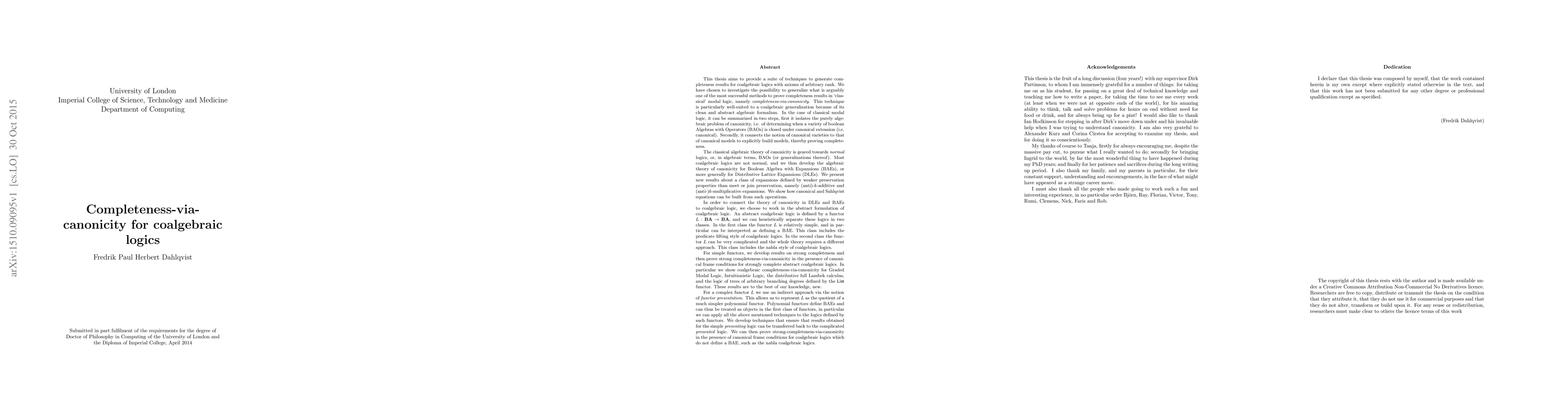 Summary: This research develops techniques to prove completeness for coalgebraic logics with rank-variable axioms using the completeness-via-canonicity method, generalizing successful methods from classical modal logic through a clean and abstract algebraic formalism.