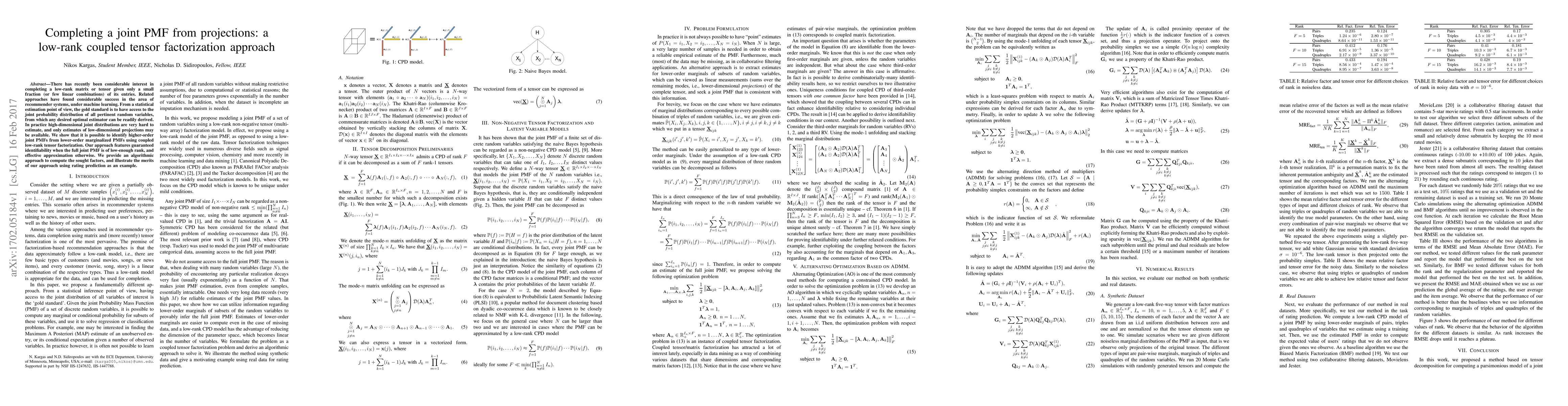 There has recently been considerable interest in completing a low-rank matrix or tensor given only a small fraction (or few linear combinations) of its entries. Related approaches have found considerable success in the area of recommender systems, under machine learning. From a statistical estimation point of view, the gold standard is to have access to the joint probability distribution of all pertinent random variables, from which any desired optimal estimator can be readily derived. In practice high-dimensional joint distributions are very hard to estimate, and only estimates of low-dimensional projections may be available. We show that it is possible to identify higher-order joint PMFs from lower-order marginalized PMFs using coupled low-rank tensor factorization. Our approach features guaranteed identifiability when the full joint PMF is of low-enough rank, and effective approximation otherwise. We provide an algorithmic approach to compute the sought factors, and illustrate the merits of our approach using rating prediction as an example.