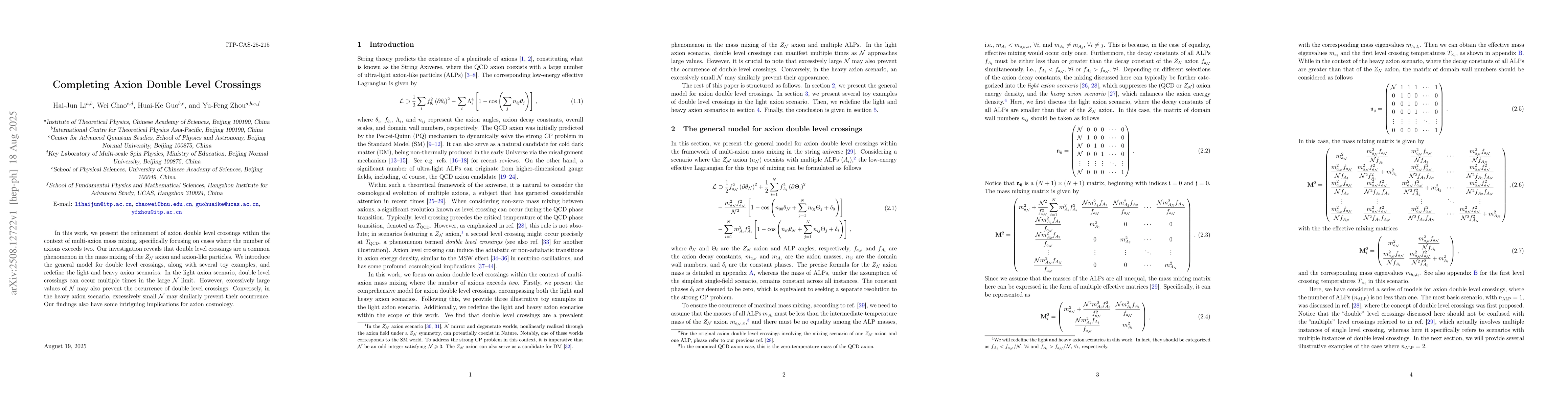 The paper presents a comprehensive model for axion double level crossings, including a matrix of domain wall numbers and mass mixing, and redefines light and heavy axion scenarios based on first-level crossing temperatures.