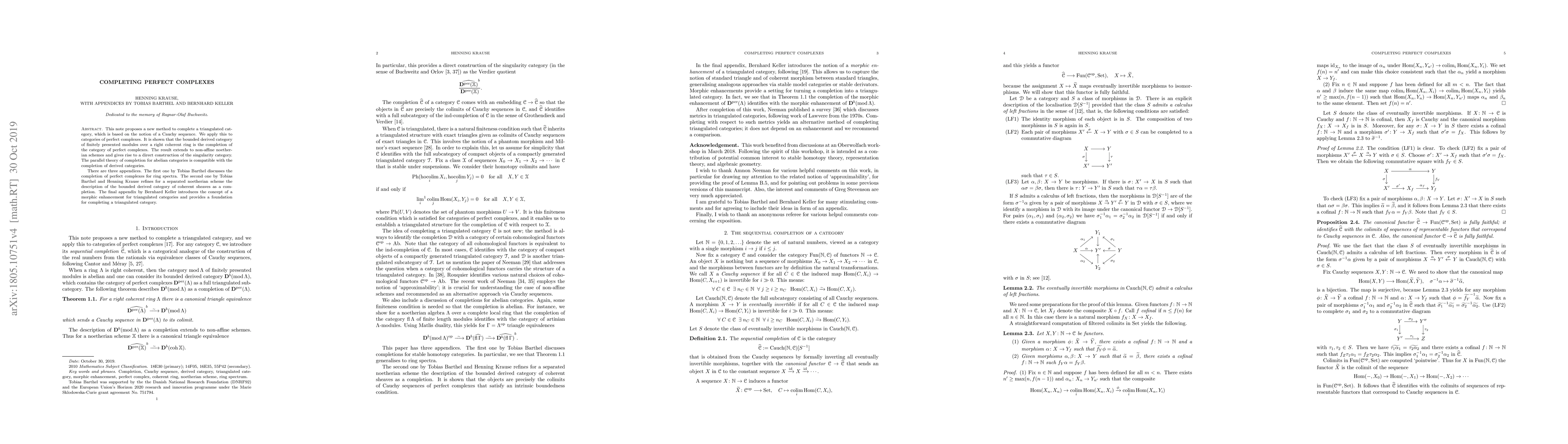 This paper introduces a novel method for completing triangulated categories using Cauchy sequences, specifically applied to perfect complexes. It demonstrates that the bounded derived category of finitely presented modules over a right coherent ring completes the category of perfect complexes, extending to non-affine noetherian schemes and facilitating the construction of the singularity category.