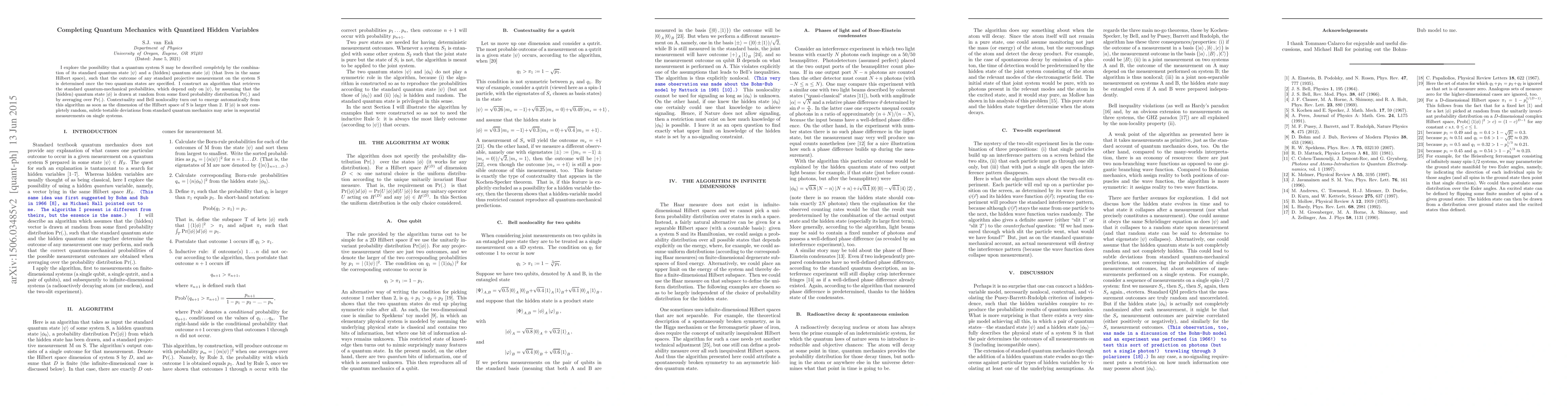I explore the possibility that a quantum system S may be described completely by the combination of its standard quantum state $|\psi\rangle$ and a (hidden) quantum state $|\phi\rangle$ (that lives in the same Hilbert space), such that the outcome of any standard projective measurement on the system S is determined once the two quantum states are specified. I construct an algorithm that retrieves the standard quantum-mechanical probabilities, which depend only on $|\psi\rangle$, by assuming that the (hidden) quantum state $|\phi\rangle$ is drawn at random from some fixed probability distribution Pr(.) and by averaging over Pr(.). Contextuality and Bell nonlocality turn out to emerge automatically from this algorithm as soon as the dimension of the Hilbert space of S is larger than 2. If $|\phi\rangle$ is not completely random, subtle testable deviations from standard quantum mechanics may arise in sequential measurements on single systems.