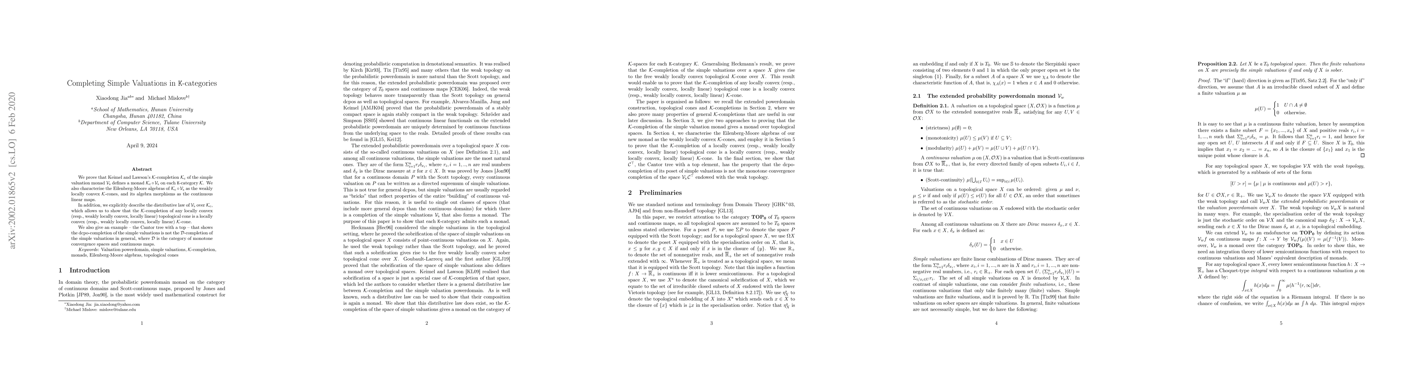We prove that Keimel and Lawson's K-completion Kc of the simple valuation monad Vs defines a monad Kc o Vs on each K-category A. We also characterize the Eilenberg-Moore algebras of Kc o Vs as the weakly locally convex K-cones, and its algebra morphisms as the continuous linear maps. In addition, we explicitly describe the distributive law of Vs over Kc, which allows us to show that the K-completion of any locally convex (respectively, weakly locally convex, locally linear) topological cone is a locally convex (respectively, weakly locally convex, locally linear) K-cone. We also give an example - the Cantor tree with a top - that shows the dcpo-completion of the simple valuations is not the D-completion of the simple valuations in general, where D is the category of monotone convergence spaces and continuous maps.