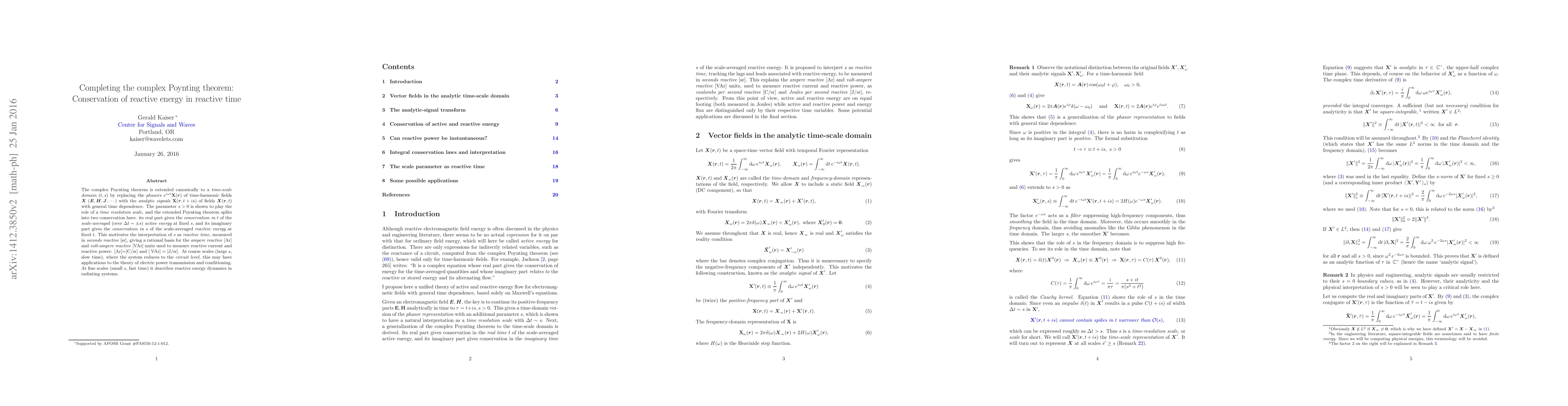 The complex Poynting theorem is extended canonically to a time-scale domain $(t, s)$ by replacing the phasors of time-harmonic fields by the analytic signals $X(r, t+is)$ of fields $X(r,t)$ with general time dependence. The imaginary time $s>0$ is shown to play the role of a time resolution scale, and the extended Poynting theorem splits into two conservation laws: its real part gives the conservation in $t$ of the scale-averaged active energy at fixed $s$, and its imaginary part gives the conservation in $s$ of the scale-averaged reactive energy at fixed $t$. At coarse scales (large $s$, slow time), where the system reduces to the circuit level, this may have applications to the theory of electric power transmission and conditioning. At fine scales (small $s$, fast time) it describes reactive energy dynamics in radiating systems.