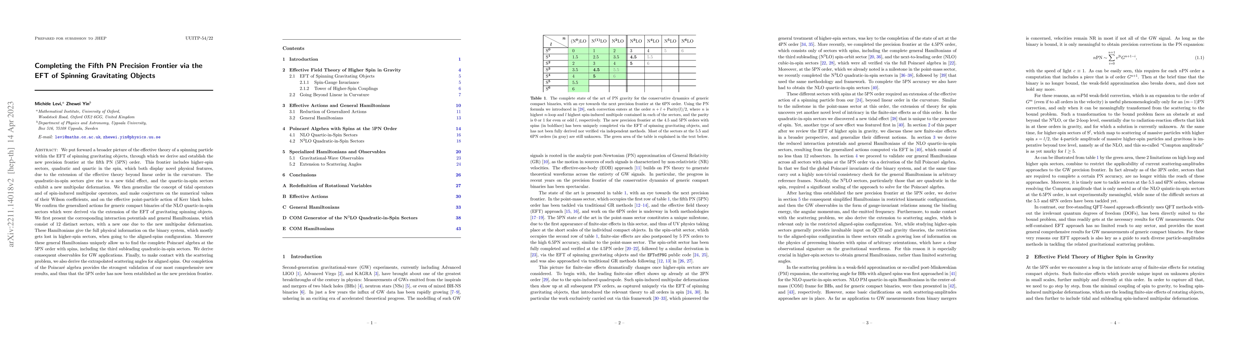 We put forward a broader picture of the effective theory of a spinning particle within the EFT of spinning gravitating objects, through which we derive and establish the new precision frontier at the fifth PN (5PN) order. This frontier includes higher-spin sectors, quadratic and quartic in the spin, which both display novel physical features, due to the extension of the effective theory beyond linear order in the curvature. The quadratic-in-spin sectors give rise to a new tidal effect, and the quartic-in-spin sectors exhibit a new multipolar deformation. We then generalize the concept of tidal operators and of spin-induced multipolar operators, and make conjectures on the numerical values of their Wilson coefficients, and on the effective point-particle action of Kerr black holes. We confirm the generalized actions for generic compact binaries of the NLO quartic-in-spin sectors which were derived via the extension of the EFT of gravitating spinning objects. We first present the corresponding interaction potentials and general Hamiltonians, which consist of 12 distinct sectors, with a new one due to the new multipolar deformation. These Hamiltonians give the full physical information on the binary system, which mostly gets lost in higher-spin sectors, when going to the aligned-spins configuration. Moreover these general Hamiltonians uniquely allow us to find the complete Poincar\'e algebra at the 5PN order with spins, including the third subleading quadratic-in-spin sectors. We derive consequent observables for GW applications. Finally, to make contact with the scattering problem, we also derive the extrapolated scattering angles for aligned spins. Our completion of the Poincar\'e algebra provides the strongest validation of our most comprehensive new results, and thus that the 5PN order has now been established as the new precision frontier.