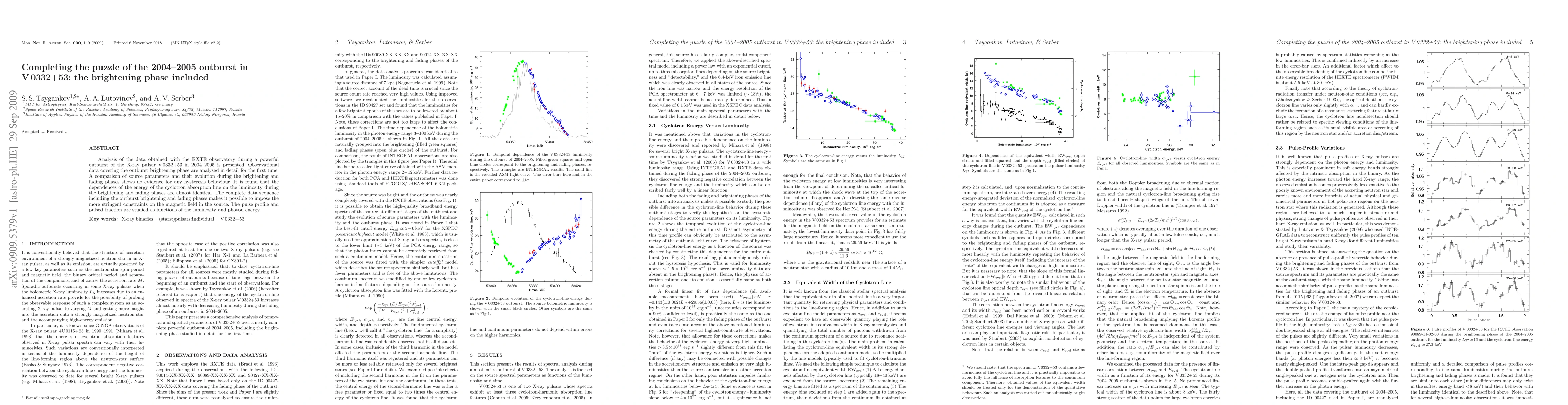 Analysis of the data obtained with the RXTE observatory during a powerful outburst of the X-ray pulsar V0332+53 in 2004-2005 is presented. Observational data covering the outburst brightening phase are analysed in detail for the first time. A comparison of source parameters and their evolution during the brightening and fading phases shows no evidence for any hysteresis behaviour. It is found that the dependences of the energy of the cyclotron absorption line on the luminosity during the brightening and fading phases are almost identical. The complete data sequence including the outburst brightening and fading phases makes it possible to impose the more stringent constraints on the magnetic field in the source. The pulse profile and pulsed fraction are studied as functions of the luminosity and photon energy.