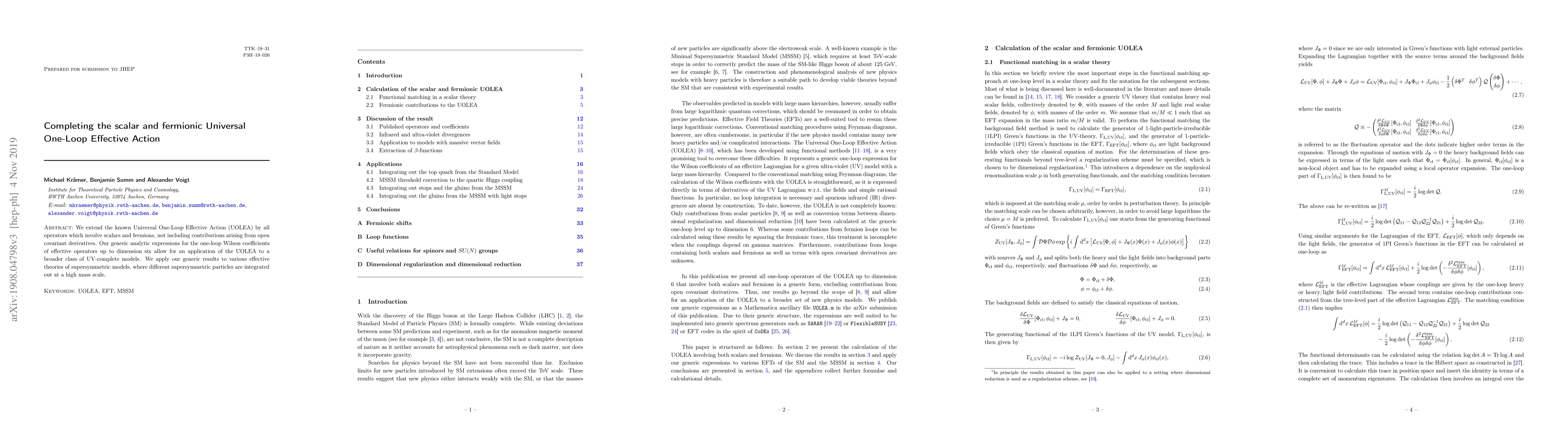 This paper completes the Universal One-Loop Effective Action (UOLEA) by incorporating scalar and fermionic operators, excluding those with open covariant derivatives. The authors provide general expressions for one-loop Wilson coefficients for operators up to dimension six, enhancing the applicability to a wider range of UV-complete models, and demonstrate this with examples from supersymmetric theories.