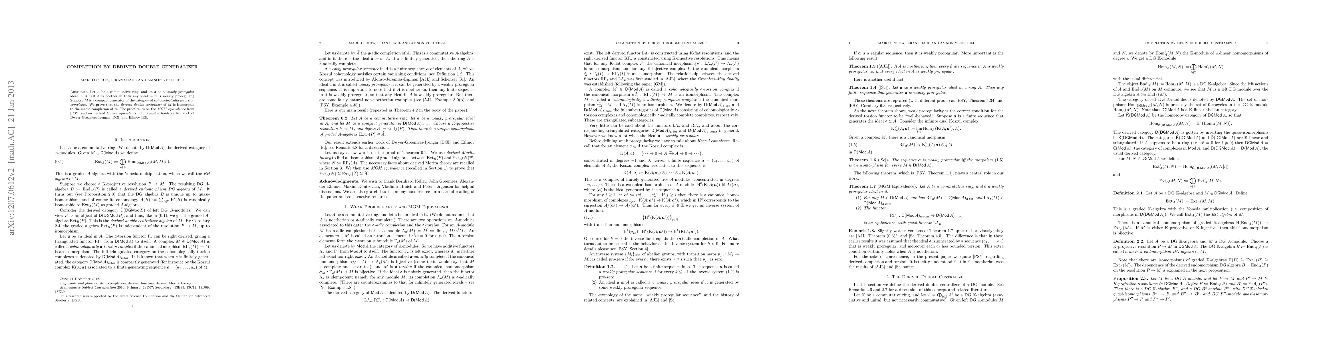 Let A be a commutative ring, and let \a be a weakly proregular ideal in A. (If A is noetherian then any ideal in it is weakly proregular.) Suppose M is a compact generator of the category of cohomologically \a-torsion complexes. We prove that the derived double centralizer of M is isomorphic to the \a-adic completion of A. The proof relies on the MGM equivalence from [PSY] and on derived Morita equivalence. Our result extends earlier work of Dwyer-Greenlees-Iyengar [DGI] and Efimov [Ef].
