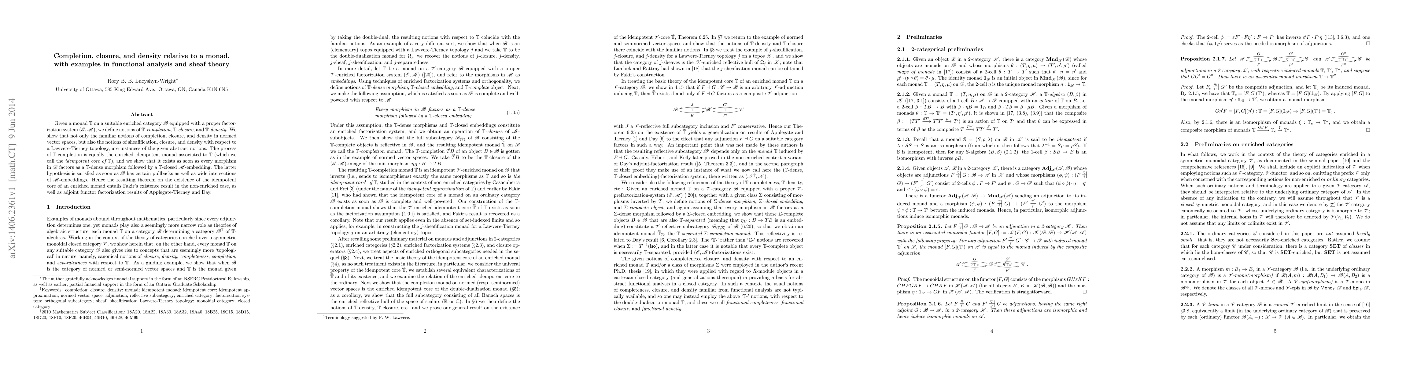 Given a monad T on a suitable enriched category B equipped with a proper factorization system (E,M), we define notions of T-completion, T-closure, and T-density. We show that not only the familiar notions of completion, closure, and density in normed vector spaces, but also the notions of sheafification, closure, and density with respect to a Lawvere-Tierney topology, are instances of the given abstract notions. The process of T-completion is equally the enriched idempotent monad associated to T (which we call the idempotent core of T), and we show that it exists as soon as every morphism in B factors as a T-dense morphism followed by a T-closed M-embedding. The latter hypothesis is satisfied as soon as B has certain pullbacks as well as wide intersections of M-embeddings. Hence the resulting theorem on the existence of the idempotent core of an enriched monad entails Fakir's existence result in the non-enriched case, as well as adjoint functor factorization results of Applegate-Tierney and Day.
