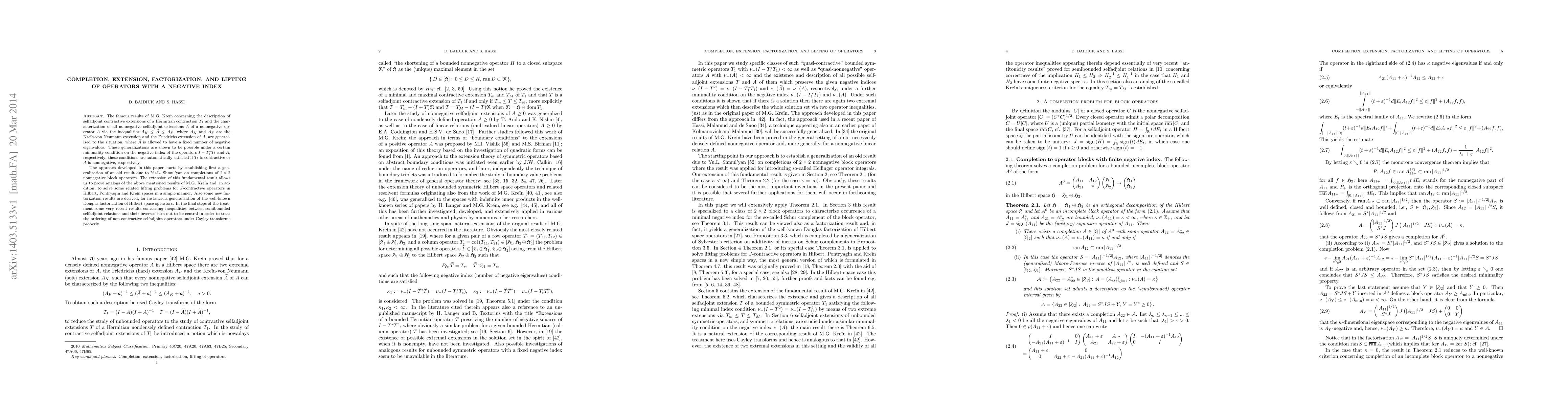 This paper generalizes Krein's results on selfadjoint extensions of Hermitian contractions to operators with negative eigenvalues, under minimality conditions. It also extends Shmul'yan's completion results for nonnegative block operators and introduces new factorization and lifting results for J-contractive operators in various spaces.