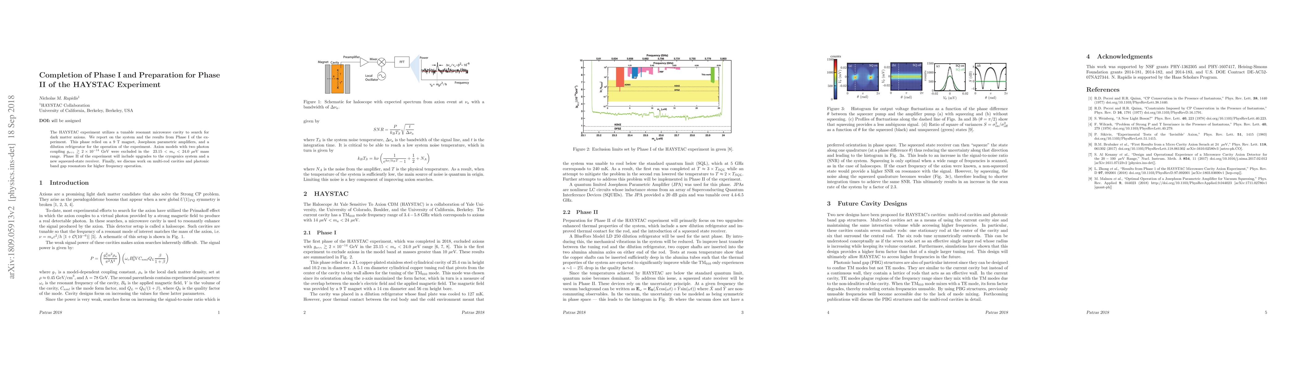 Researchers completed Phase I of the HAYSTAC experiment, ruling out axion models with a photon coupling above 2 x 10^-14 GeV in a specific mass range. Phase II is planned with upgrades to cryogenics and a new receiver.