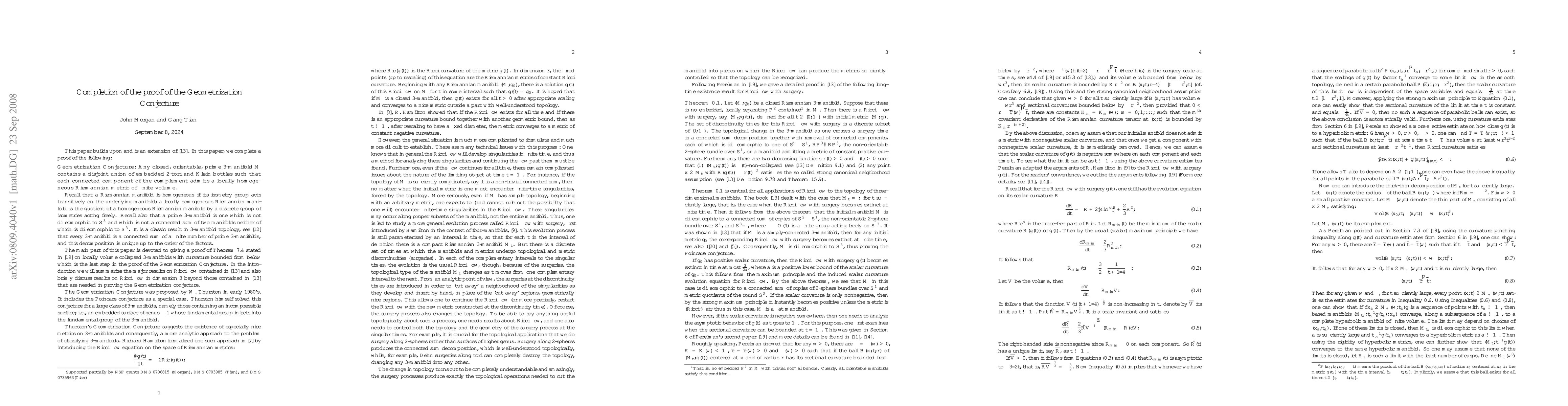 This paper completes the proof of the Geometrization Conjecture for all compact, orientable three-manifolds by extending techniques from Ricci flow and surgery, utilizing Alexandrov spaces to analyze the collapsed manifold regions, and establishing that these regions are graph manifolds with incompressible boundaries.
