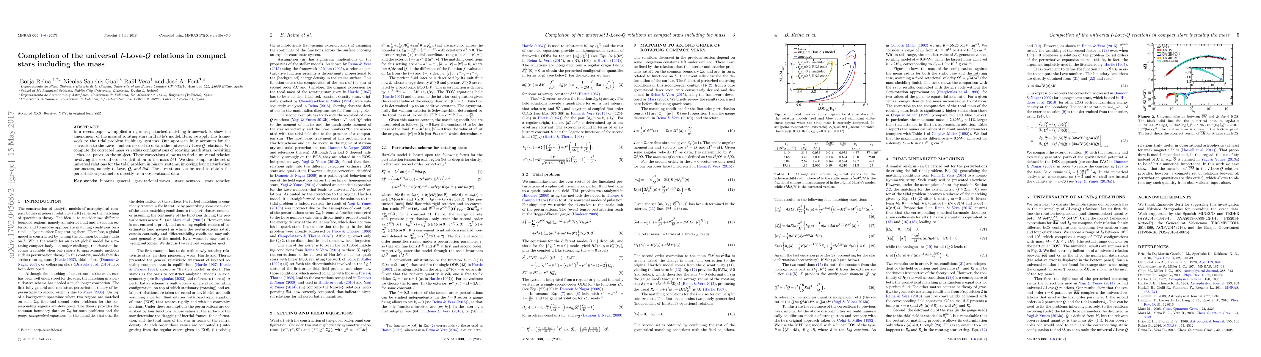 In a recent paper we applied a rigorous perturbed matching framework to show the amendment of the mass of rotating stars in Hartle's model. Here, we apply this framework to the tidal problem in binary systems. Our approach fully accounts for the correction to the Love numbers needed to obtain the universal $I$-Love-$Q$ relations. We compute the corrected mass vs radius configurations of rotating quark stars, revisiting a classical paper on the subject. These corrections allow us to find a universal relation involving the second-order contribution to the mass $\delta M$. We thus complete the set of universal relations for the tidal problem in binary systems, involving four perturbation parameters, namely $I$, Love, $Q$, and $\delta M$. These relations can be used to obtain the perturbation parameters directly from observational data.