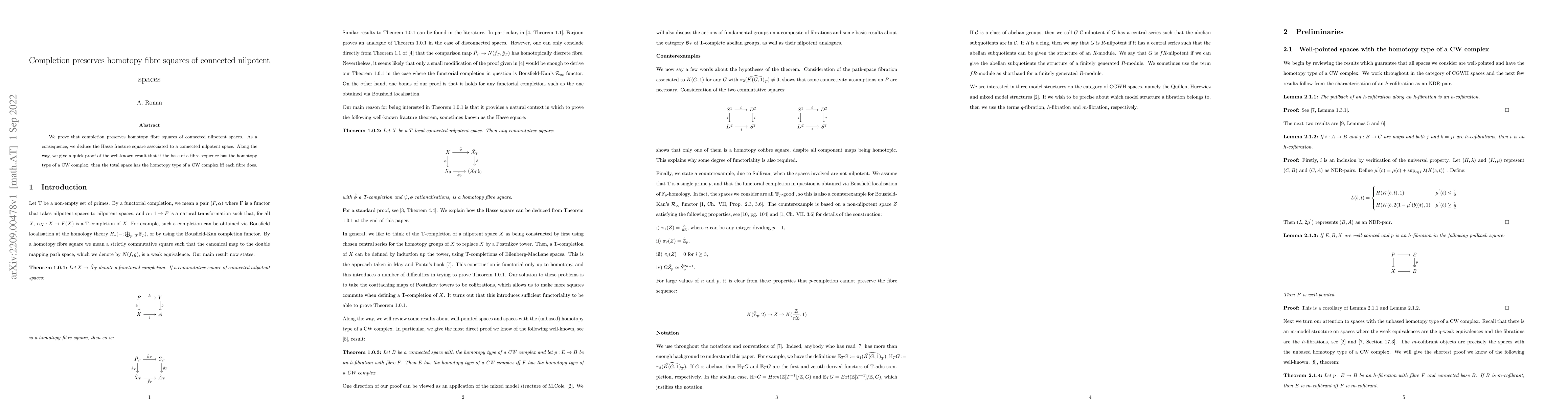 This paper proves that completion at specified primes maintains homotopy fibre squares in connected nilpotent spaces, leading to the derivation of the Hasse fracture square. It also provides a concise proof for the result that total spaces resemble CW complexes if their fibres do, given a base space with a similar homotopy type.