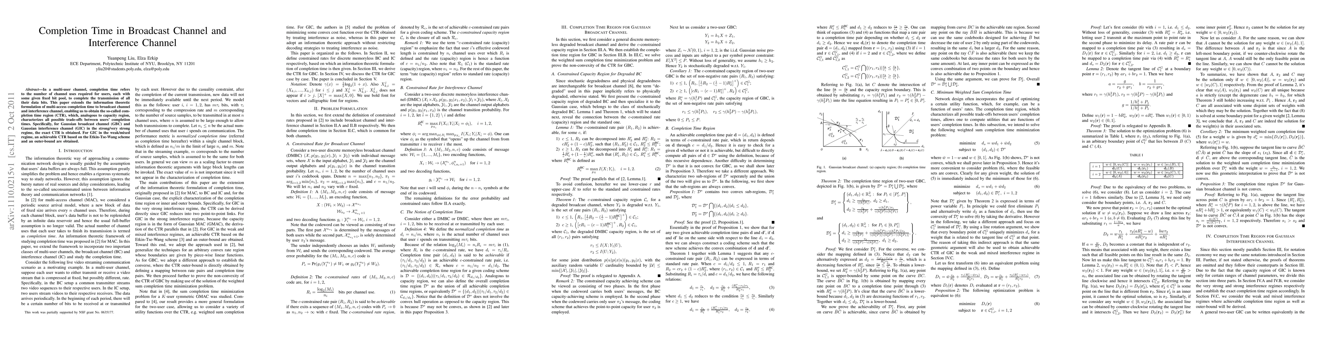 In a multi-user channel, completion time refers to the number of channel uses required for users, each with some given fixed bit pool, to complete the transmission of all their data bits. This paper extends the information theoretic formulation of multi-access completion time to broadcast channel and interference channel, enabling us to obtain the so-called completion time region (CTR), which, analogous to capacity region, characterizes all possible trade-offs between users' completion times. Specifically, for Gaussian broadcast channel (GBC) and Gaussian interference channel (GIC) in the strong/very strong regime, the exact CTR is obtained. For GIC in the weak/mixed regime, an achievable CTR based on the Etkin-Tse-Wang scheme and an outer-bound are obtained.