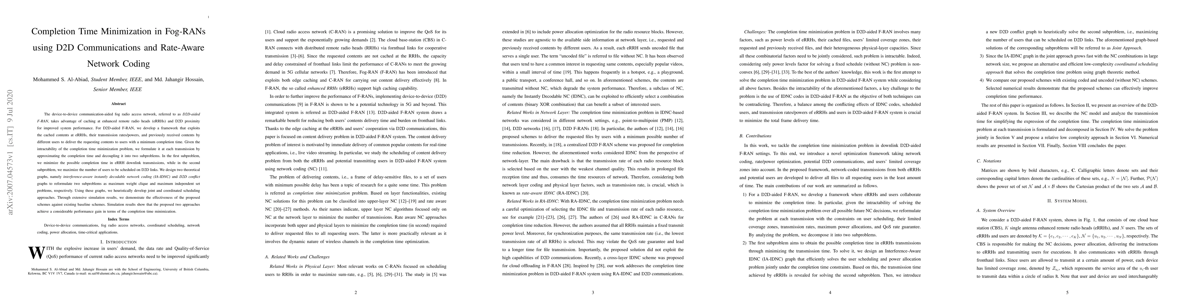 The device-to-device communication-aided fog radio access network, referred to as \textit{D2D-aided F-RAN}, takes advantage of caching at enhanced remote radio heads (eRRHs) and D2D proximity for improved system performance. For D2D-aided F-RAN, we develop a framework that exploits the cached contents at eRRHs, their transmission rates/powers, and previously received contents by different users to deliver the requesting contents to users with a minimum completion time. Given the intractability of the completion time minimization problem, we formulate it at each transmission by approximating the completion time and decoupling it into two subproblems. In the first subproblem, we minimize the possible completion time in eRRH downlink transmissions, while in the second subproblem, we maximize the number of users to be scheduled on D2D links. We design two theoretical graphs, namely \textit{interference-aware instantly decodable network coding (IA-IDNC)} and \textit{D2D conflict} graphs to reformulate two subproblems as maximum weight clique and maximum independent set problems, respectively. Using these graphs, we heuristically develop joint and coordinated scheduling approaches. Through extensive simulation results, we demonstrate the effectiveness of the proposed schemes against existing baseline schemes. Simulation results show that the proposed two approaches achieve a considerable performance gain in terms of the completion time minimization.