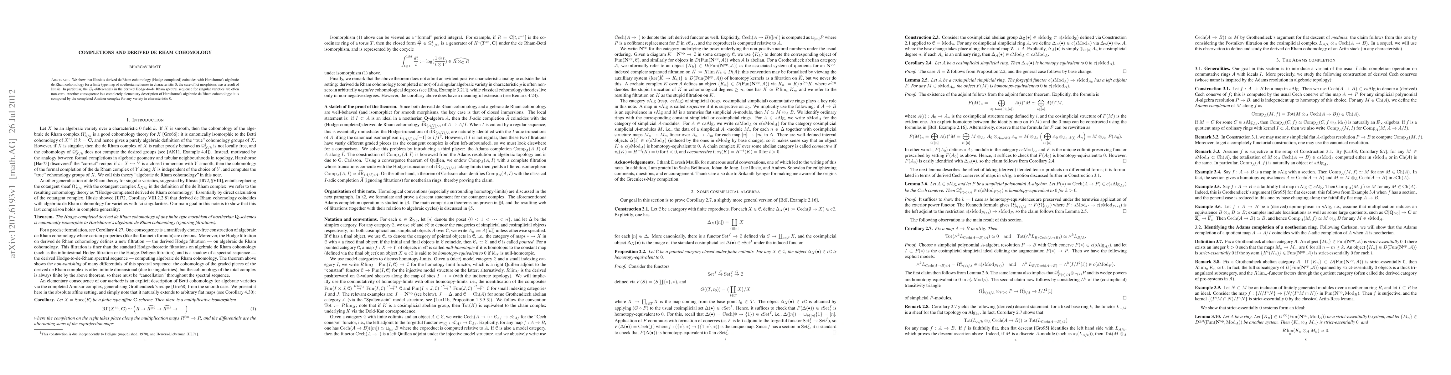 We show that Illusie's derived de Rham cohomology (Hodge-completed) coincides with Hartshorne's algebraic de Rham cohomology for a finite type map of noetherian schemes in characteristic 0; the case of lci morphisms was a result of Illusie. In particular, the E_1-differentials in the derived Hodge-to-de Rham spectral sequence for singular varieties are often non-zero. Another consequence is a completely elementary description of Hartshorne's algebraic de Rham cohomology: it is computed by the completed Amitsur complex for any variety in characteristic 0.