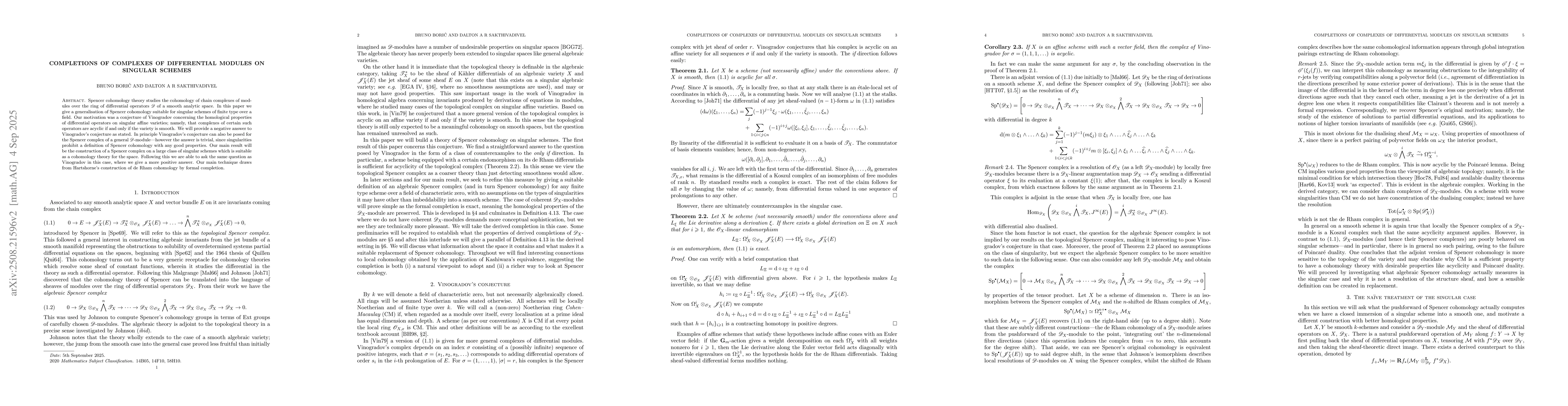Spencer cohomology theory studies the cohomology of chain complexes of modules over the ring of differential operators $\mathscr{D}$ of a smooth analytic space. In this paper we give a generalisation of Spencer cohomology suitable for singular schemes of finite type over a field. Our motivation was a conjecture of Vinogradov concerning the homological properties of differential operators on singular affine varieties; namely, that complexes of certain such operators are acyclic if and only if the variety is smooth. We will provide a negative answer to Vinogradov's conjecture as stated. In principle Vinogradov's conjecture can also be posed for the Spencer complex of a general $\mathscr{D}$-module -- however the answer is trivial, since singularities prohibit a definition of Spencer cohomology with any good properties. Our main result will be the construction of a Spencer complex on a large class of singular schemes which is suitable as a cohomology theory for the space. Following this we are able to ask the same question as Vinogradov in this case, where we give a more positive answer. Our main technique draws from Hartshorne's construction of de Rham cohomology by formal completion.