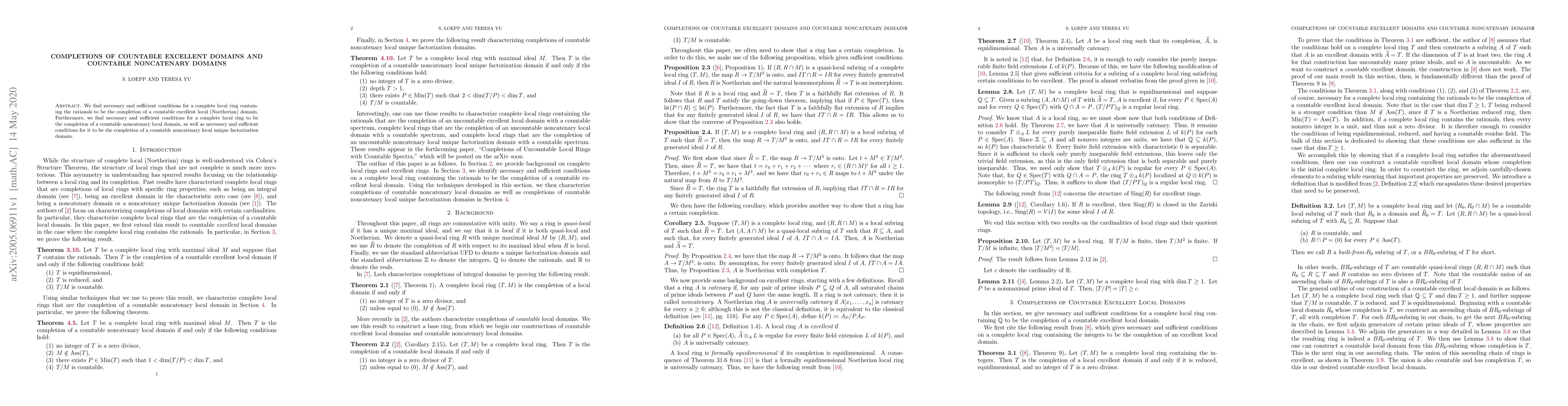 We find necessary and sufficient conditions for a complete local ring containing the rationals to be the completion of a countable excellent local (Noetherian) domain. Furthermore, we find necessary and sufficient conditions for a complete local ring to be the completion of a countable noncatenary local domain, as well as necessary and sufficient conditions for it to be the completion of a countable noncatenary local unique factorization domain.