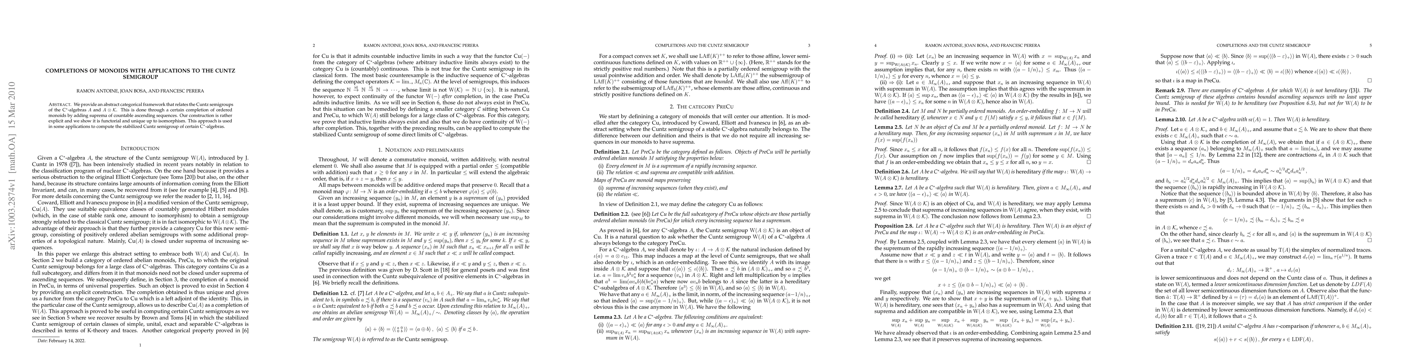 This paper constructs a categorical framework for completing ordered monoids by adding suprema of countable ascending sequences, providing a functorial and unique relation between the Cuntz semigroups of C$^*$-algebras $A$ and $A\otimes \mathcal{K}$. Applications include computing the stabilized Cuntz semigroup for specific C$^*$-algebras.