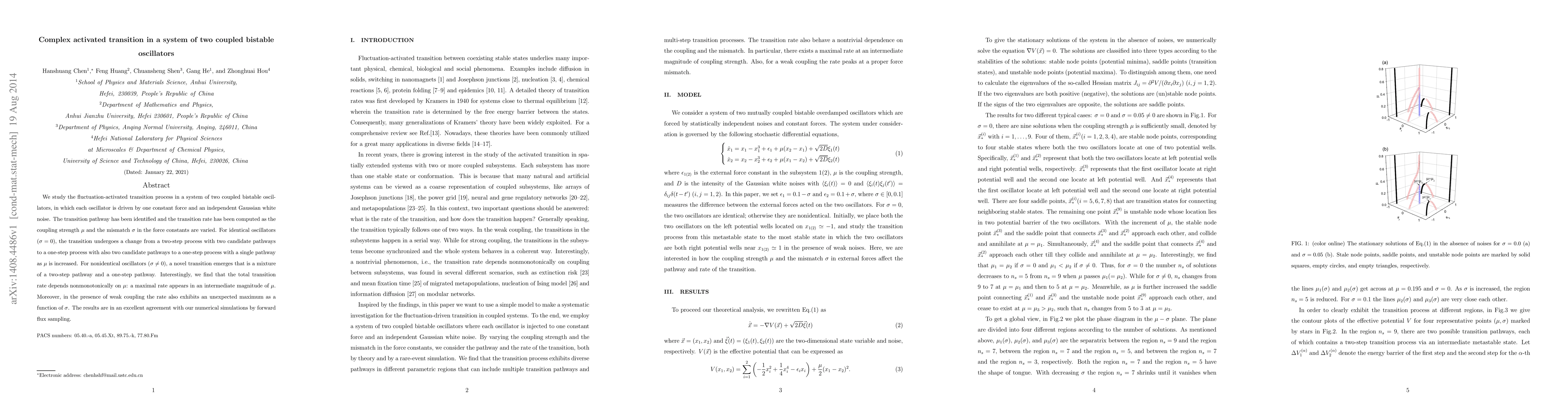 This study investigates the fluctuation-activated transition in a coupled bistable oscillator system, revealing a complex transition pathway that varies with coupling strength and force mismatch. The transition rate shows nonmonotonic dependence on these parameters, with maximal rates observed at intermediate coupling strengths.