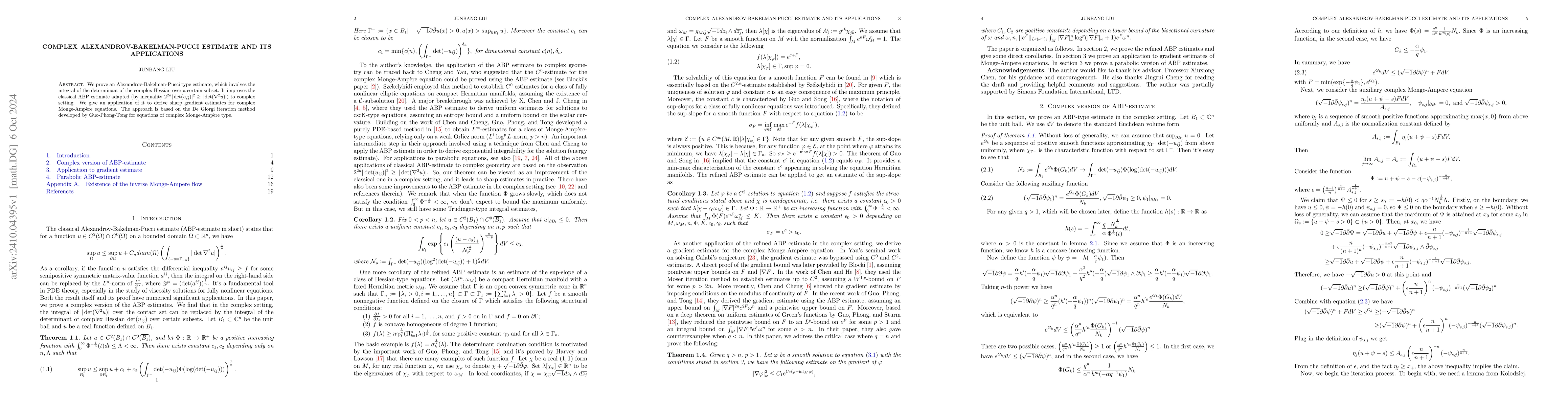 We prove an Alexandrov-Bakelman-Pucci type estimate, which involves the integral of the determinant of the complex Hessian over a certain subset. It improves the classical ABP estimate adapted (by inequality $2^{2n}|\det(u_{i\bar{j}})|^2\geq |\det(\nabla^2u)|$) to complex setting. We give an application of it to derive sharp gradient estimates for complex Monge-Amp\`ere equations. The approach is based on the De Giorgi iteration method developed by Guo-Phong-Tong for equations of complex Monge-Amp\`ere type.