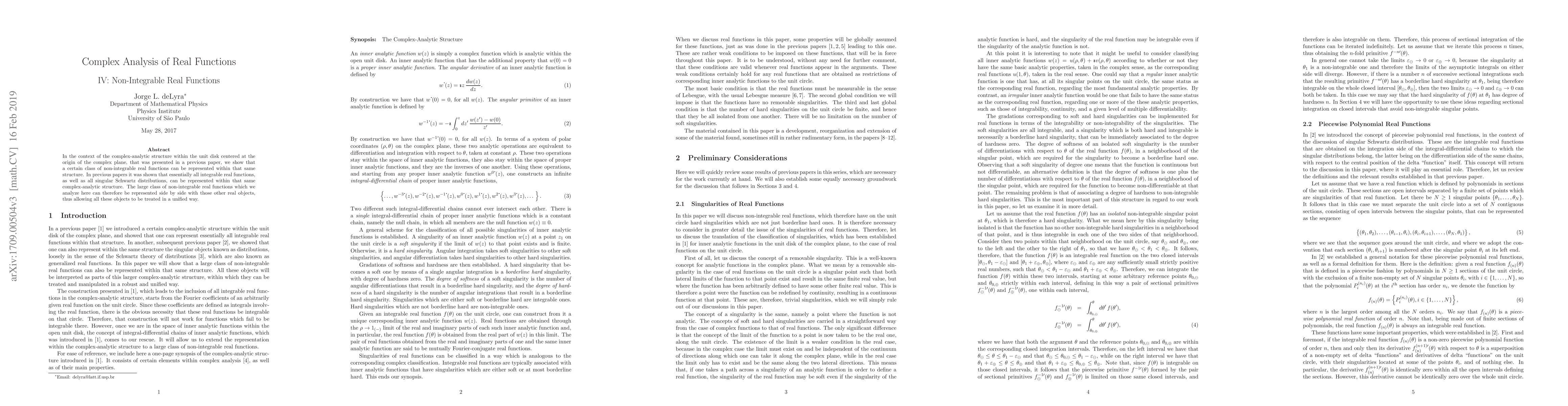 This paper extends the complex-analytic framework from previous works to represent a class of non-integrable real functions, alongside integrable real functions and singular Schwartz distributions, enabling unified treatment of these diverse real objects.