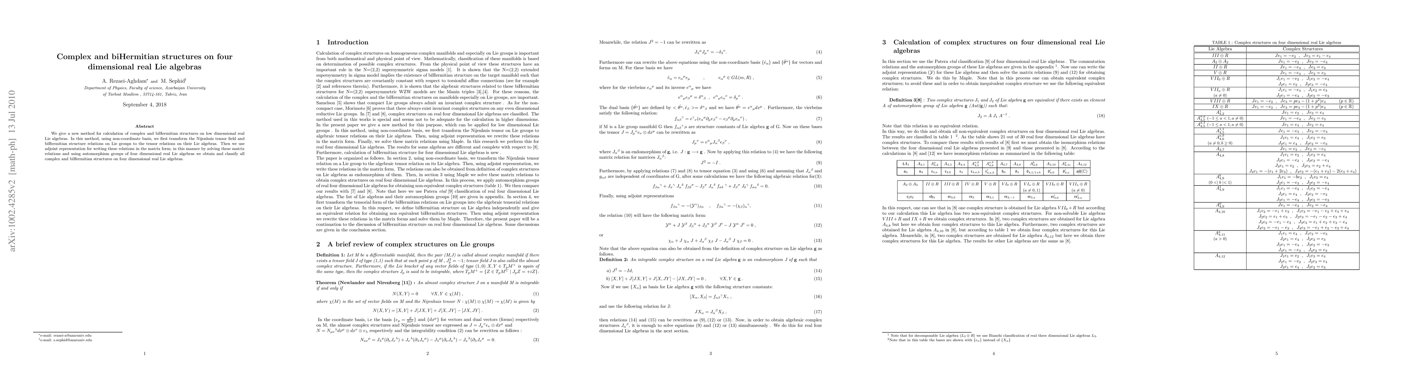We give a new method for calculation of complex and biHermitian structures on low dimensional real Lie algebras. In this method, using non-coordinate basis, we first transform the Nijenhuis tensor field and biHermitian structure relations on Lie groups to the tensor relations on their Lie algebras. Then we use adjoint representation for writing these relations in the matrix form; in this manner by solving these matrix relations and using automorphism groups of four dimensional real Lie algebras we obtain and classify all complex and biHermitian structures on four dimensional real Lie algebras.