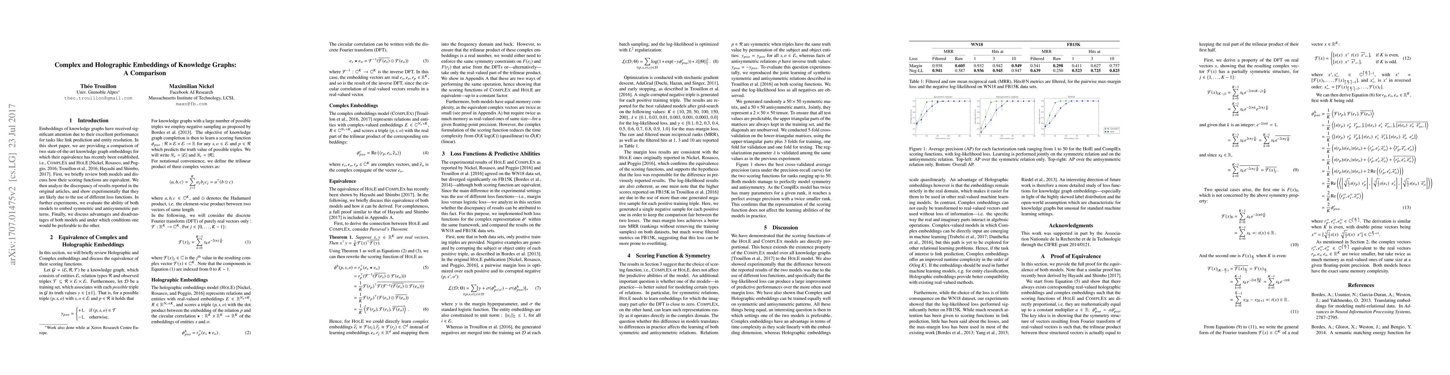 This paper compares the state-of-the-art knowledge graph embeddings ComplEx and HolE, showing their equivalent scoring functions and analyzing discrepancies in their results due to different loss functions. It evaluates both models' performance on embedding symmetric and antisymmetric patterns, and discusses their respective advantages and conditions for preference.