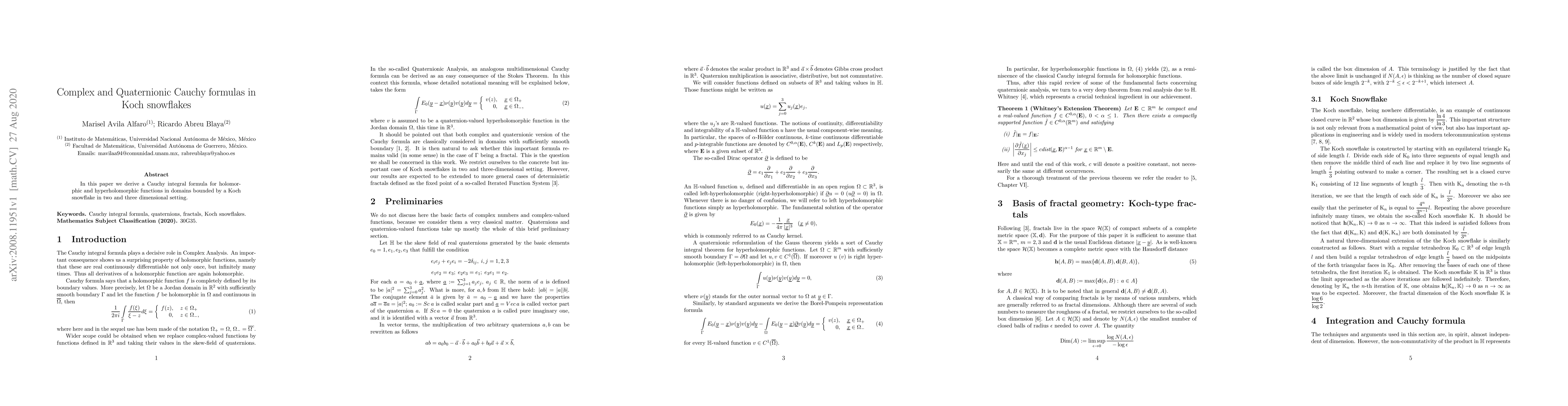 In this paper we derive a Cauchy integral formula for holomorphic and hyperholomorphic functions in domains bounded by a Koch snowflake in two and three dimensional setting.