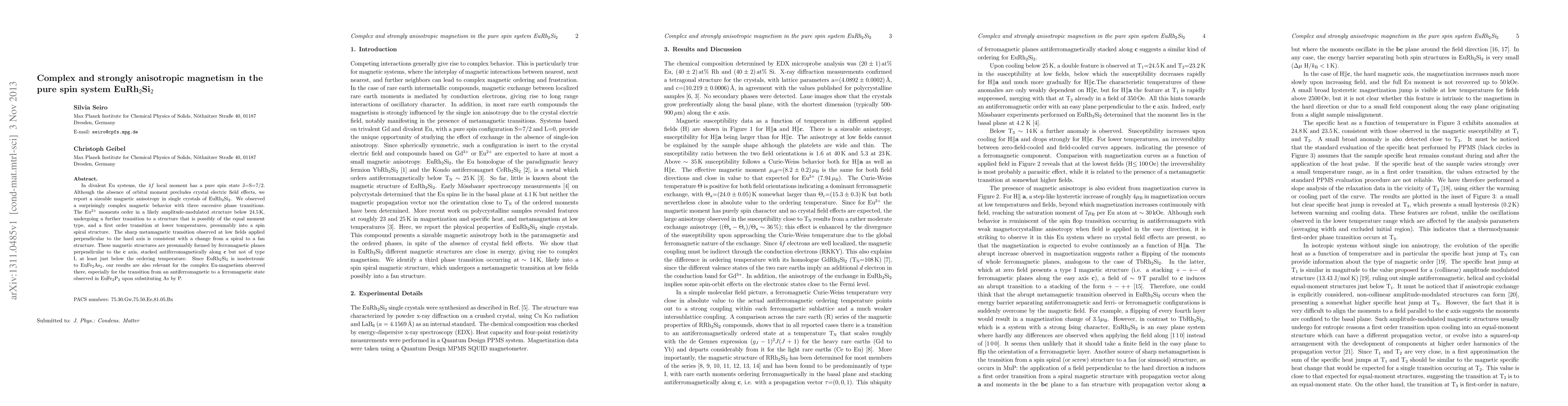In divalent Eu systems, the 4f local moment has a pure spin state J=S=7/2. Although the absence of orbital moment precludes crystal electric field effects, we report a sizeable magnetic anisotropy in single crystals of EuRh2Si2. We observed a surprisingly complex magnetic behavior with three succesive phase transitions. The Eu2+ moments order in a likely amplitude-modulated structure below 24.5K, undergoing a further transition to a structure that is possibly of the equal moment type, and a first order transition at lower temperatures, presumably into a spin spiral structure. The sharp metamagnetic transition observed at low fields applied perpendicular to the hard axis is consistent with a change from a spiral to a fan structure. These magnetic structures are presumably formed by ferromagnetic planes perpendicular to the c axis, stacked antiferromagnetically along c but not of type I, at least just below the ordering temperature. Since EuRh2Si2 is isoelectronic to EuFe2As2, our results are also relevant for the complex Eu-magnetism observed there, especially for the transition from an antiferromagnetic to a ferromagnetic state observed in EuFe2P2 upon substituting As by P.
