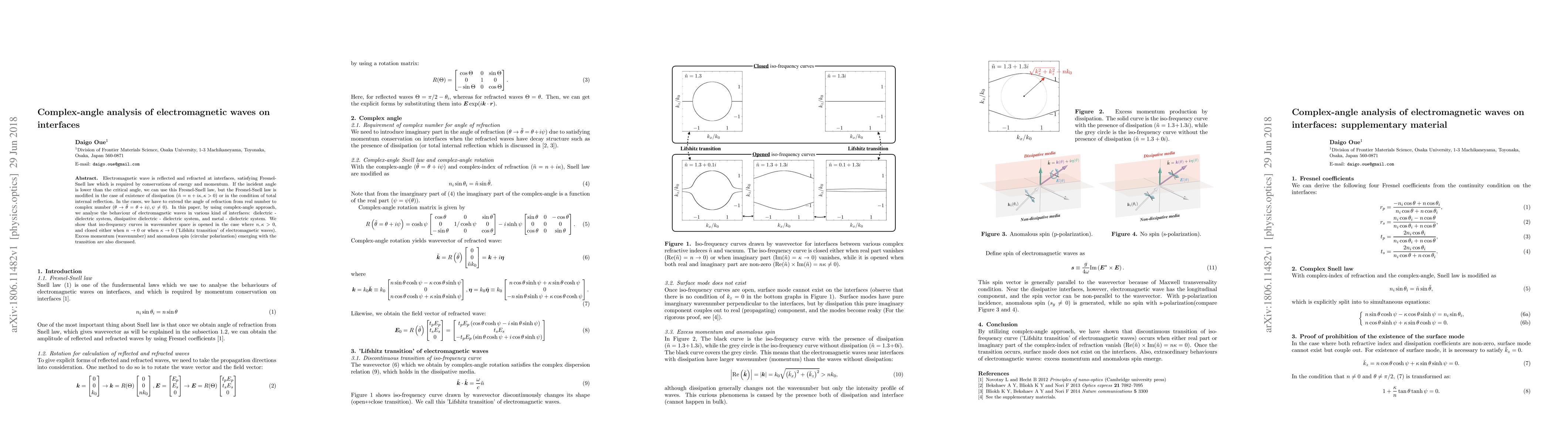 Electromagnetic wave is reflected and refracted at interfaces, satisfying Fresnel-Snell law which is required by conservations of energy and momentum. If the incident angle is lower than the critical angle, we can use this Fresnel-Snell law, but the Fresnel-Snell law is modified in the case of existence of dissipation ($\tilde{n} = n + i\kappa, \kappa > 0$) or in the condition of total internal reflection. In the cases, we have to extend the angle of refraction from real number to complex number ($\theta \rightarrow \tilde{\theta} = \theta + i\psi, \psi \neq 0$). In this paper, by using complex-angle approach, we analyse the behaviour of electromagnetic waves in various kind of interfaces: dielectric - dielectric system, dissipative dielectric - dielectric system, and metal - dielectric system. We show that iso-frequency curves in wavenumber space is opened in the case where $n, \kappa > 0$, and closed either when $n \rightarrow 0$ or when $\kappa \rightarrow 0$ ("Lifshitz transition" of electromagnetic waves). Excess momentum (wavenumber) and anomalous spin (circular polarization) emerging with the transition are also discussed.