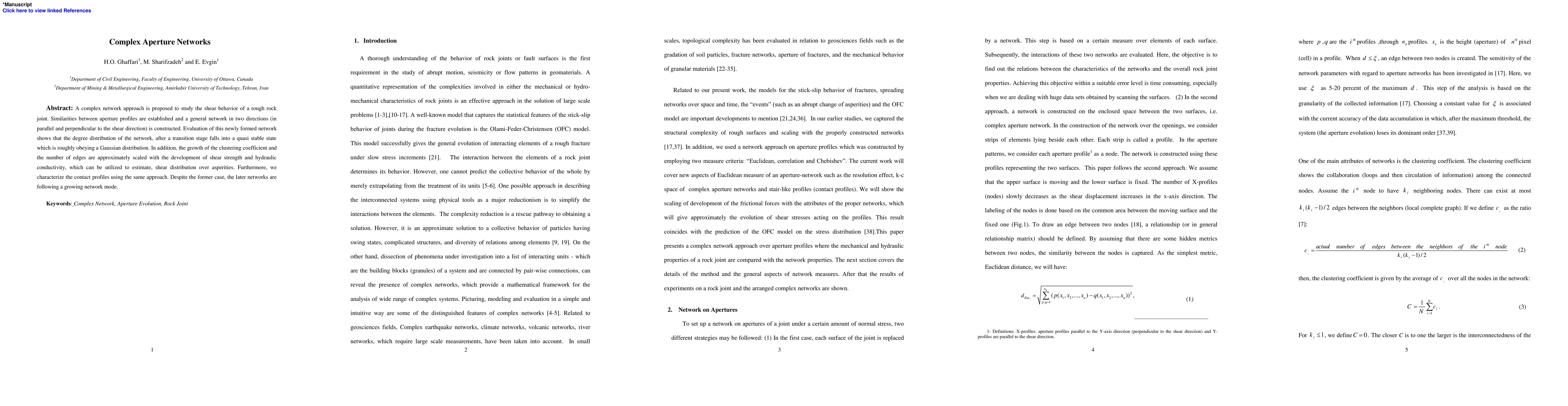 A complex network approach is proposed to study the shear behavior of a rough rock joint. Similarities between aperture profiles are established and a general network in two directions (in parallel and perpendicular to the shear direction) is constructed. Evaluation of this newly formed network shows that the degree distribution of the network, after a transition stage falls into a quasi stable state which is roughly obeying a Gaussian distribution. In addition, the growth of the clustering coefficient and the number of edges are approximately scaled with the development of shear strength and hydraulic conductivity, which can be utilized to estimate, shear distribution over asperities. Furthermore, we characterize the contact profiles using the same approach. Despite the former case, the later networks are following a growing network mode.
