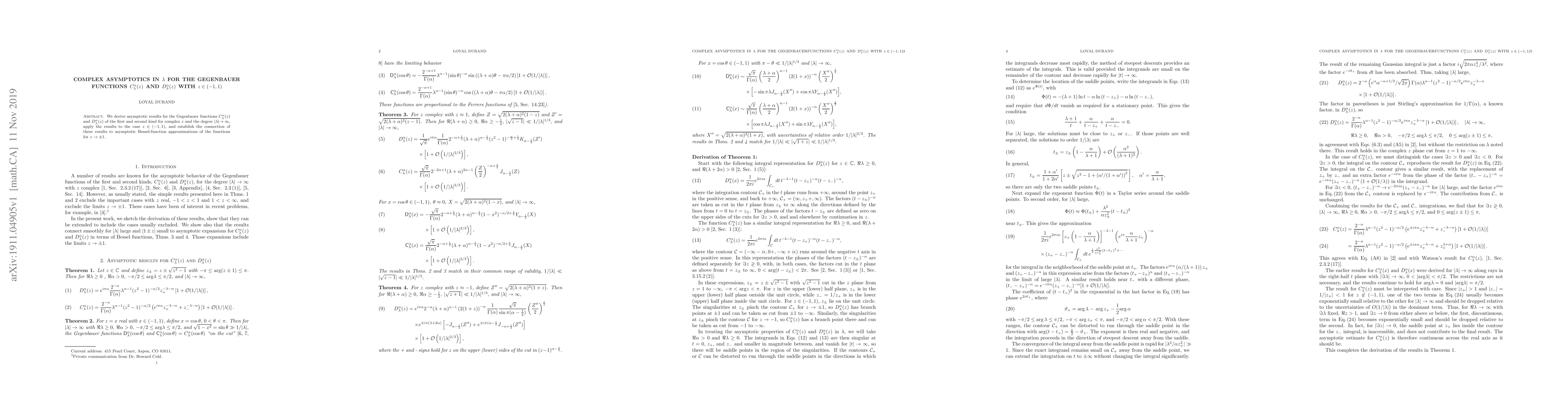 We derive asymptotic results for the Gegenbauer functions C_\lambda^\alpha(z) and D_\lambda^\alpha(z) of the first and second kind for complex z and the degree \lambda -> \infty, apply the results to the case z \in (-1,1), and establish the connection of these results to asymptotic Bessel-function approximations of the functions for z\rightarrow \pm 1.