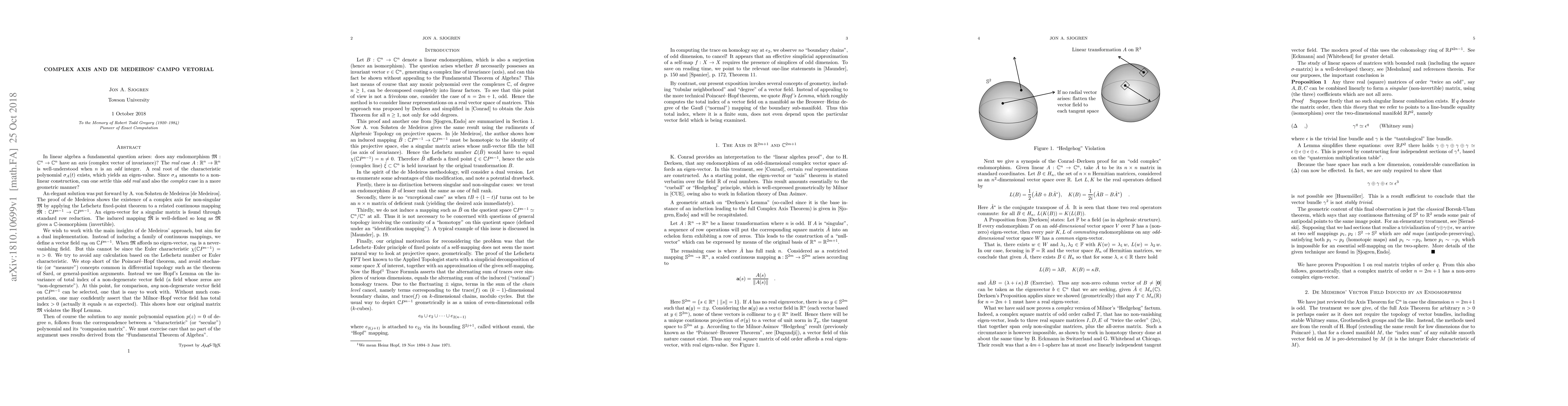 The Complex Axis theorem states that any endomorphism of a finite-dimensional complex vector space affords an eigen-vector (or "invariant axis"). A geometric proof of this geometric result was given by A. de Medeiros, transforming the endomorphism into a topological self-map with Lefschetz number not equal to zero. We give a dual version of this proof, which may be more uniform, and does not rely on the need to do any calculation of an Euler characteristic or Lefschetz number. A vector field on Projective space is read off directly from the coordinates ("entries") of the given endomorphism (complex square matrix). A bordism is defined between such vector fields by means of Stokes' Theorem applied to a real manifold-with-boundary. This is the principle behind Hopf's lemma relating the Gauss map and the index of a vector field. All vector fields of the de Medeiros type are co-bordant to the Milnor-Hopf vector field. This latter comes from a non-derogatory, real diagonal endomorphism, so clearly possesses an eigen-vector. Therefore so has the given arbitrary endomorphism. The main theorem on complex polynomials naturally follows, using the companion matrix, secular polynomial reciprocity. The geometric Complex Axis derivation is meant to avoid determinants or "general position" arguments.