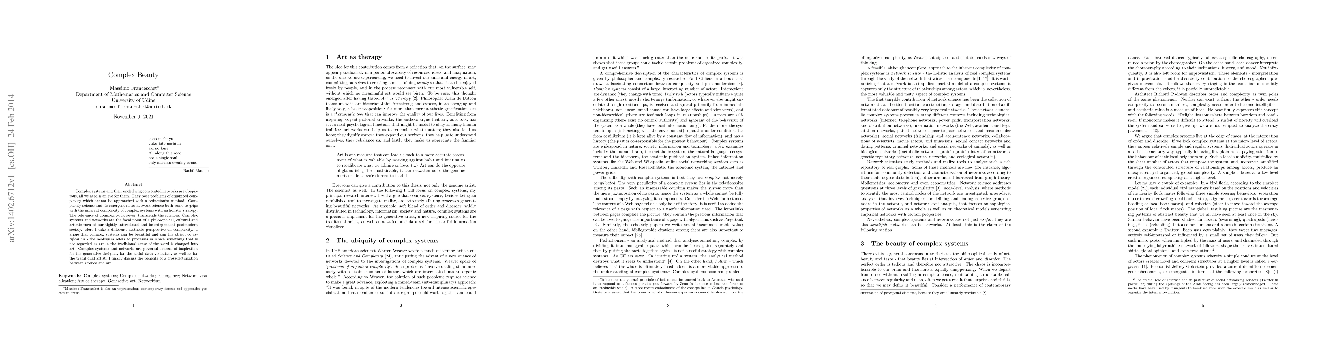 Complex systems and their underlying convoluted networks are ubiquitous, all we need is an eye for them. They pose problems of organized complexity which cannot be approached with a reductionist method. Complexity science and its emergent sister network science both come to grips with the inherent complexity of complex systems with an holistic strategy. The relevance of complexity, however, transcends the sciences. Complex systems and networks are the focal point of a philosophical, cultural and artistic turn of our tightly interrelated and interdependent postmodern society. Here I take a different, aesthetic perspective on complexity. I argue that complex systems can be beautiful and can the object of artification - the neologism refers to processes in which something that is not regarded as art in the traditional sense of the word is changed into art. Complex systems and networks are powerful sources of inspiration for the generative designer, for the artful data visualizer, as well as for the traditional artist. I finally discuss the benefits of a cross-fertilization between science and art.