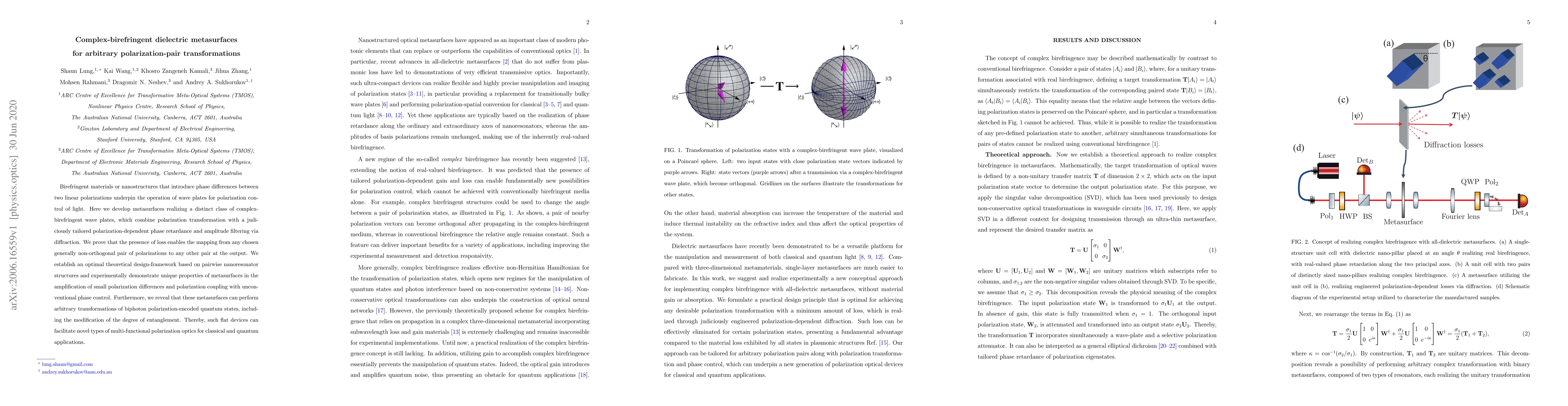 This paper introduces complex-birefringent dielectric metasurfaces that enable arbitrary transformations between non-orthogonal polarization pairs, including quantum states, through tailored phase retardance and amplitude filtering. It demonstrates their potential for multi-functional polarization optics in both classical and quantum applications.