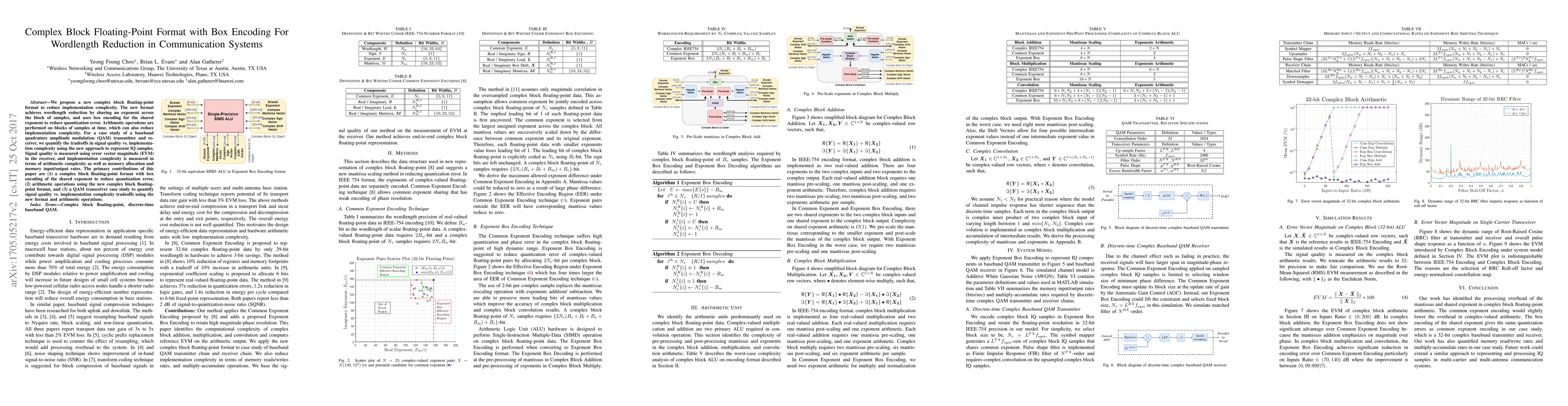 This paper introduces a novel complex block floating-point format with box encoding for shared exponent to reduce wordlength and quantization error, and demonstrates its application in a baseband QAM transceiver to balance signal quality and implementation complexity. The study quantifies tradeoffs using error vector magnitude and arithmetic complexity metrics.