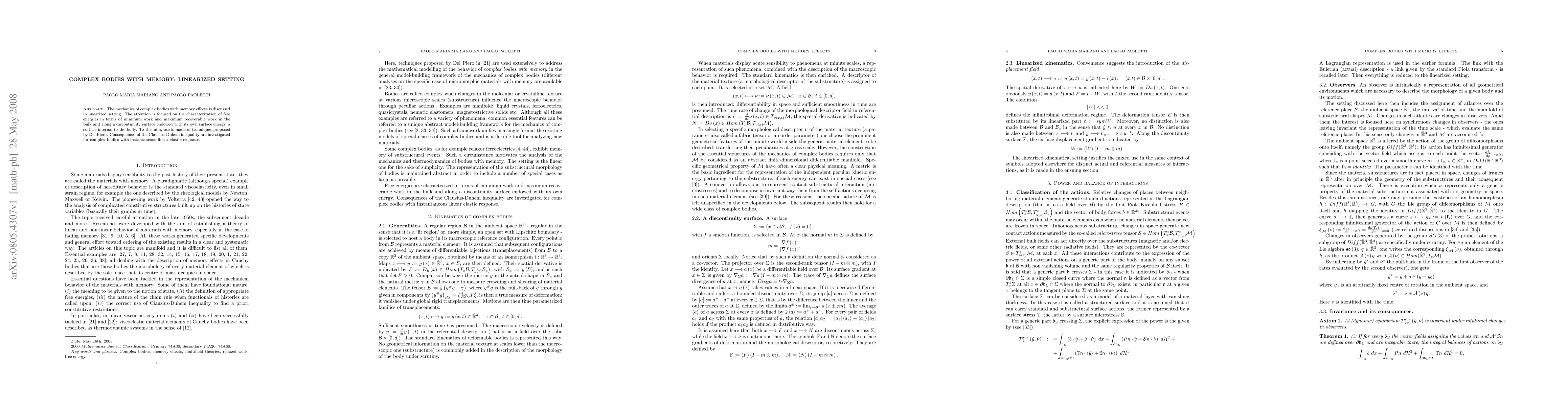 The mechanics of complex bodies with memory effects is discussed in linearized setting. The attention is focused on the characterization of free energies in terms of minimum work and maximum recoverable work in the bulk and along a discontinuity surface endowed with its own surface energy, a surface internal to the body. To this aim, use is made of techniques proposed by Del Piero. Consequences of the Clausius-Duhem inequality are investigated for complex bodies with instantaneous linear elastic response.