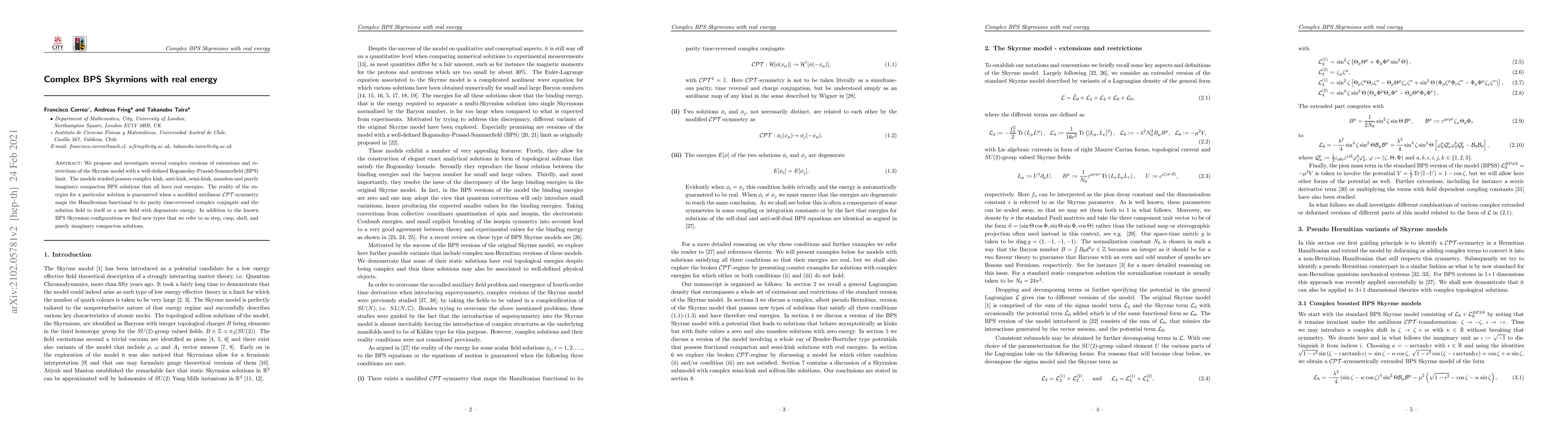 Researchers propose and discover new complex BPS Skyrmion solutions with real energies in a modified Skyrme model, including step, cusp, shell, and purely imaginary compacton configurations.