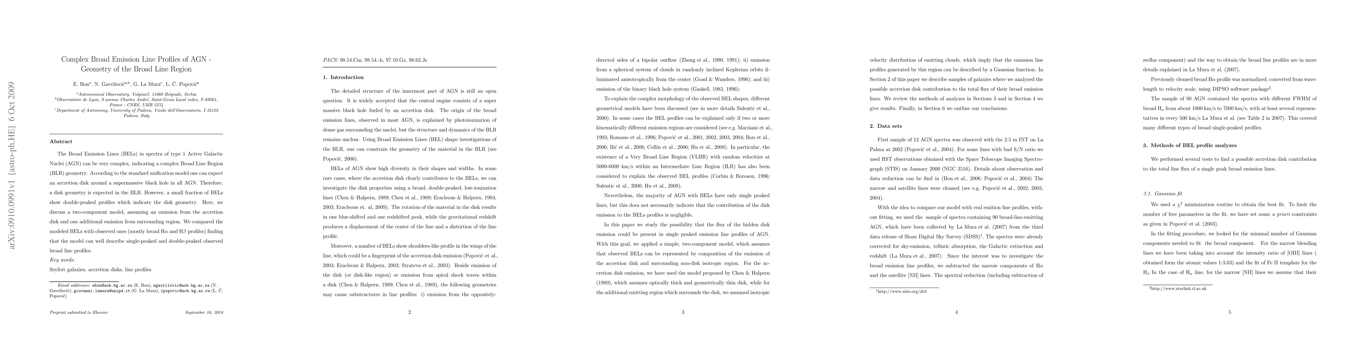 The Broad Emission Lines (BELs) in spectra of type 1 Active Galactic Nuclei (AGN) can be very complex, indicating a complex Broad Line Region (BLR) geometry. According to the standard unification model one can expect an accretion disk around a supermassive black hole in all AGN. Therefore, a disk geometry is expected in the BLR. However, a small fraction of BELs show double-peaked profiles which indicate the disk geometry. Here, we discuss a two-component model, assuming an emission from the accretion disk and one additional emission from surrounding region. We compared the modeled BELs with observed ones (mostly broad H$\alpha$ and H$\beta$ profiles) finding that the model can well describe single-peaked and double-peaked observed broad line profiles.