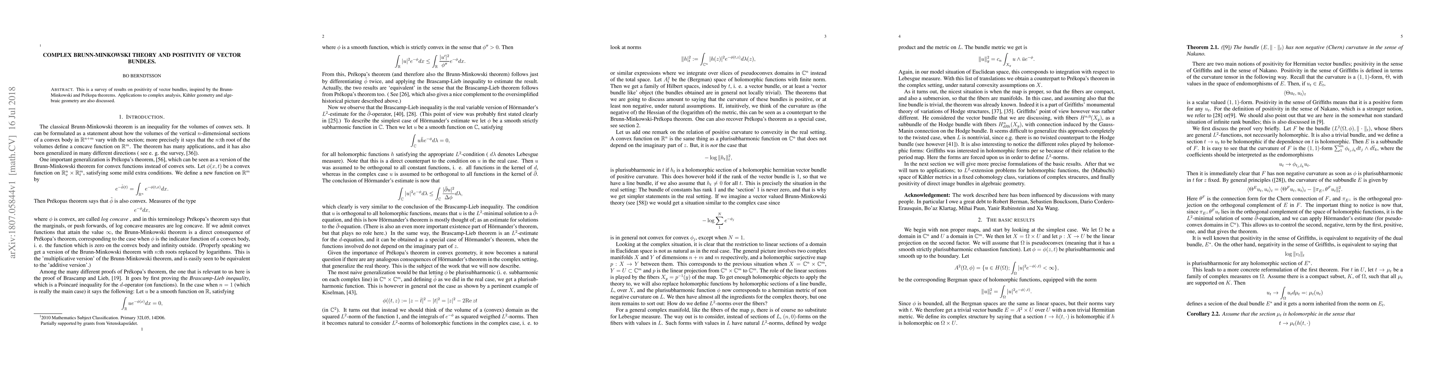 This paper surveys the application of Brunn-Minkowski theory to the positivity of vector bundles, drawing connections to Pr\'ekopa theorems and exploring implications in complex analysis, K\"ahler geometry, and algebraic geometry.
