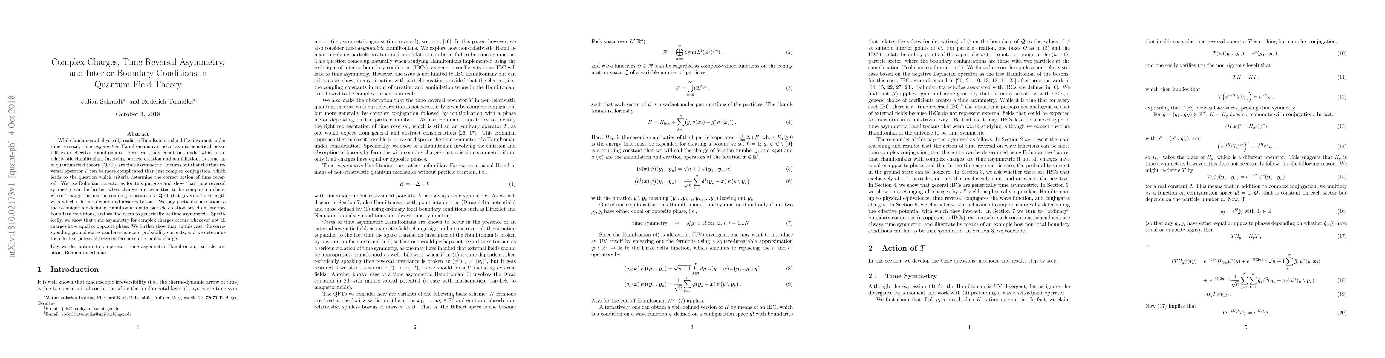 This paper investigates time asymmetry in non-relativistic Hamiltonians within quantum field theory, revealing that complex charges can break time reversal symmetry. The study uses Bohmian trajectories and finds that time asymmetry arises when charges do not have equal or opposite phases, leading to non-zero probability currents in ground states and an effective potential between fermions.