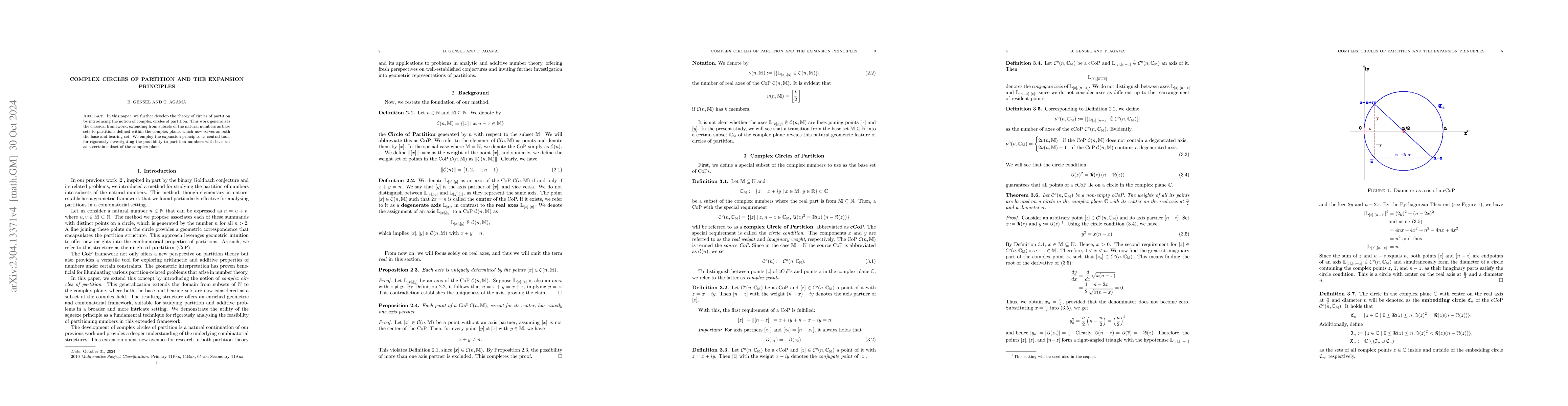 This paper extends the concept of circles of partition to the complex plane, enhancing their application from natural numbers to complex sets. The squeeze principle is utilized to explore the partitioning possibilities within these complex structures.