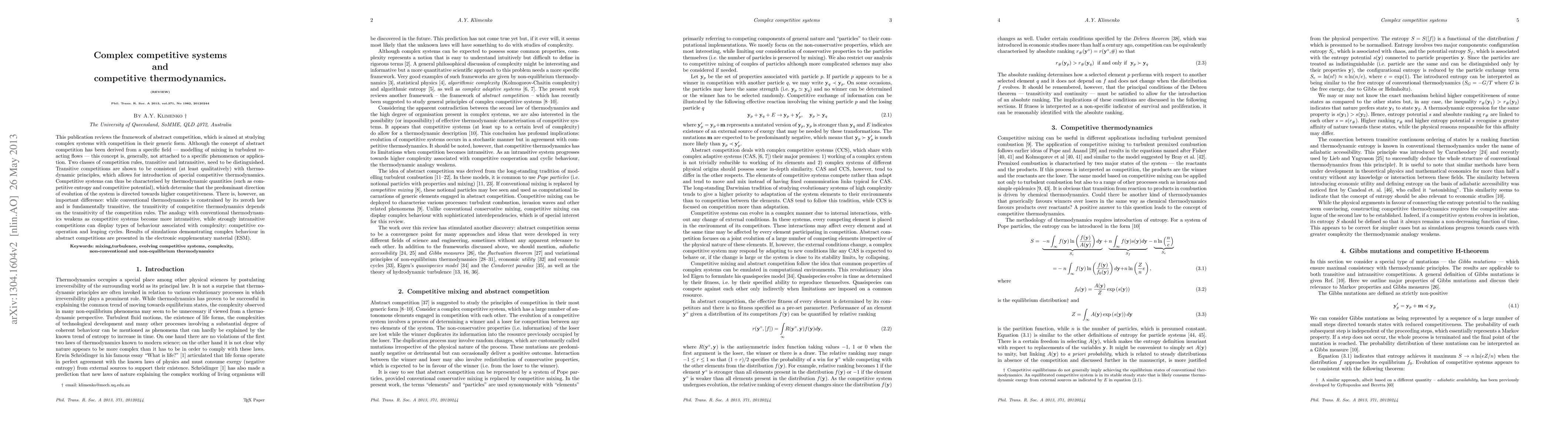 This publication reviews the framework of abstract competition, which is aimed at studying complex systems with competition in their generic form. Although the concept of abstract competition has been derived from a specific field - modelling of mixing in turbulent reacting flows - this concept is, generally, not attached to a specific phenomenon or application. Two classes of competition rules, transitive and intransitive, need to be distinguished. Transitive competitions are shown to be consistent (at least qualitatively) with thermodynamic principles, which allows for introduction of special competitive thermodynamics. Competitive systems can thus be characterised by thermodynamic quantities (such as competitive entropy and competitive potential), which determine that the predominant direction of evolution of the system is directed towards higher competitiveness. There is, however, an important difference: while conventional thermodynamics is constrained by its zeroth law and is fundamentally transitive, the transitivity of competitive thermodynamics depends on the transitivity of the competition rules. The analogy with conventional thermodynamics weakens as competitive systems become more intransitive, while strongly intransitive competitions can display types of behaviour associated with complexity: competitive cooperation and leaping cycles. Results of simulations demonstrating complex behaviour in abstract competitions are presented in the electronic supplementary material (ESM).